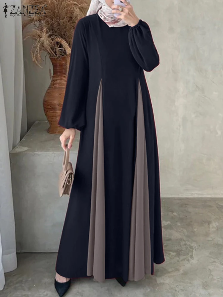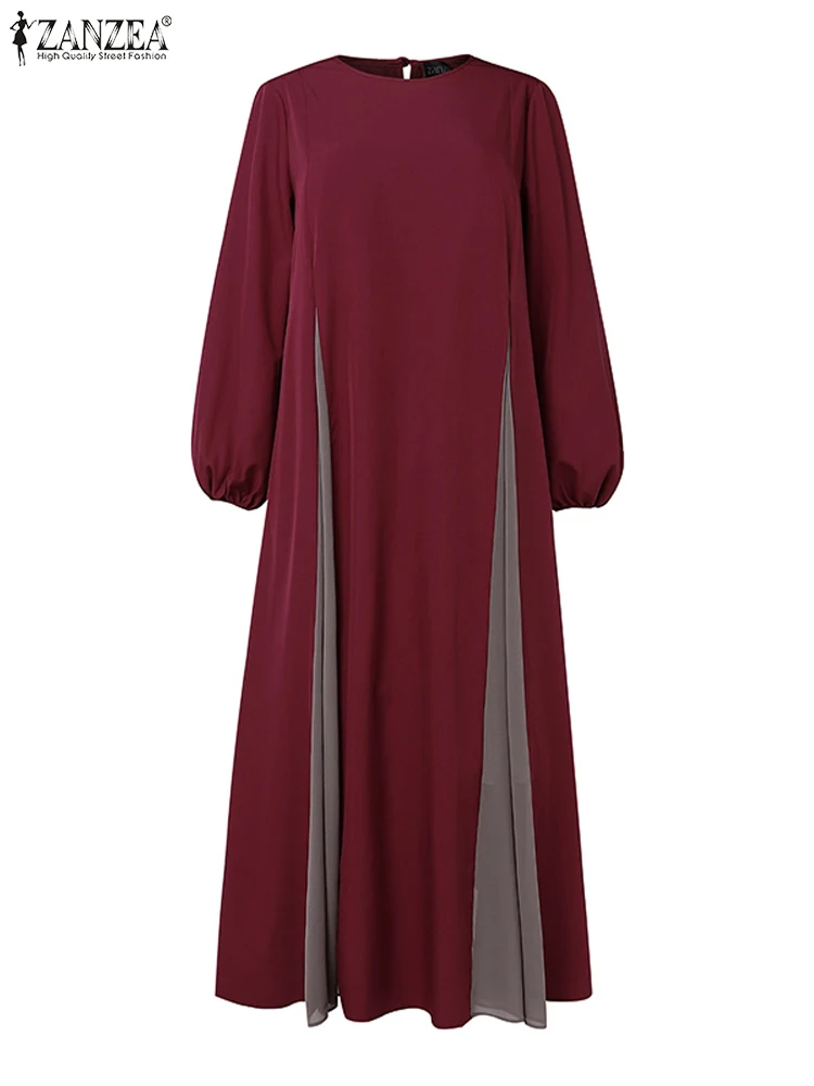 Hijabs modeste femmes Robes longues ZANZEA élégant col rond manches longues contraste-couleur Patchwork Abaya Robes musulman robe Maxi ample |