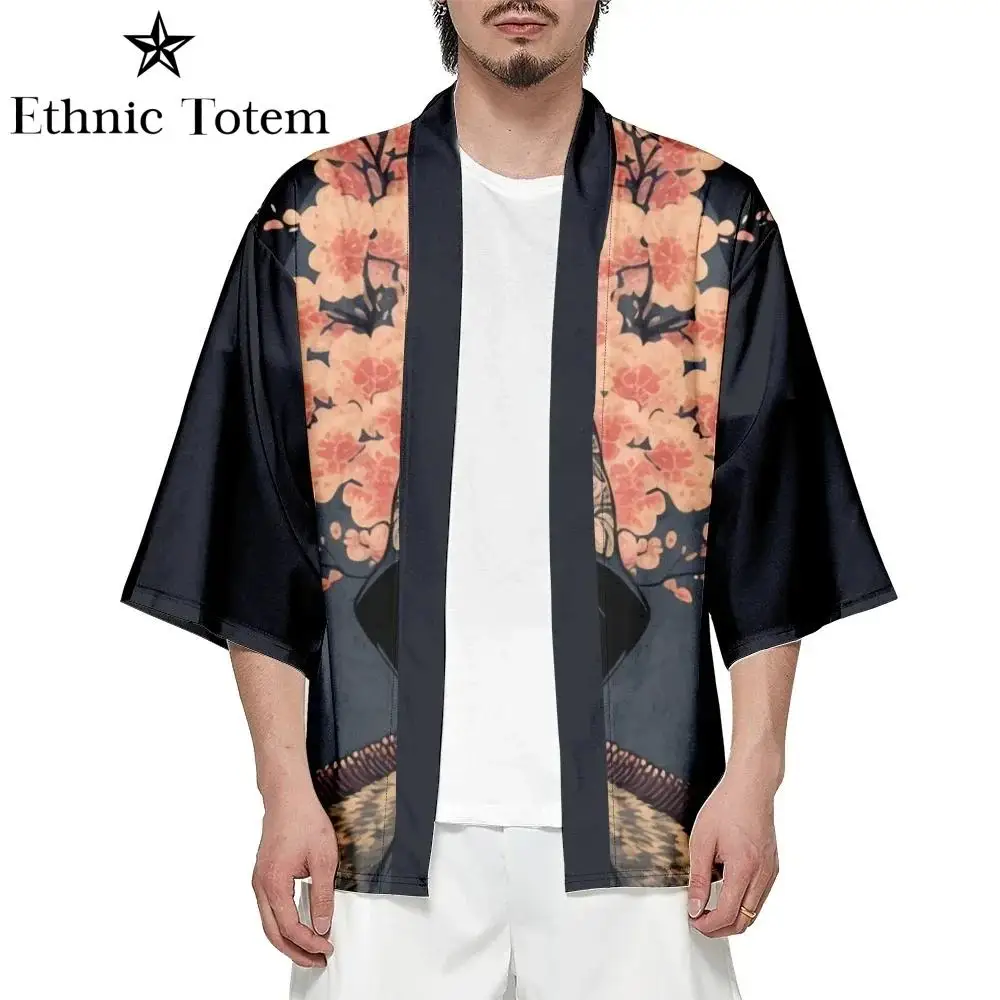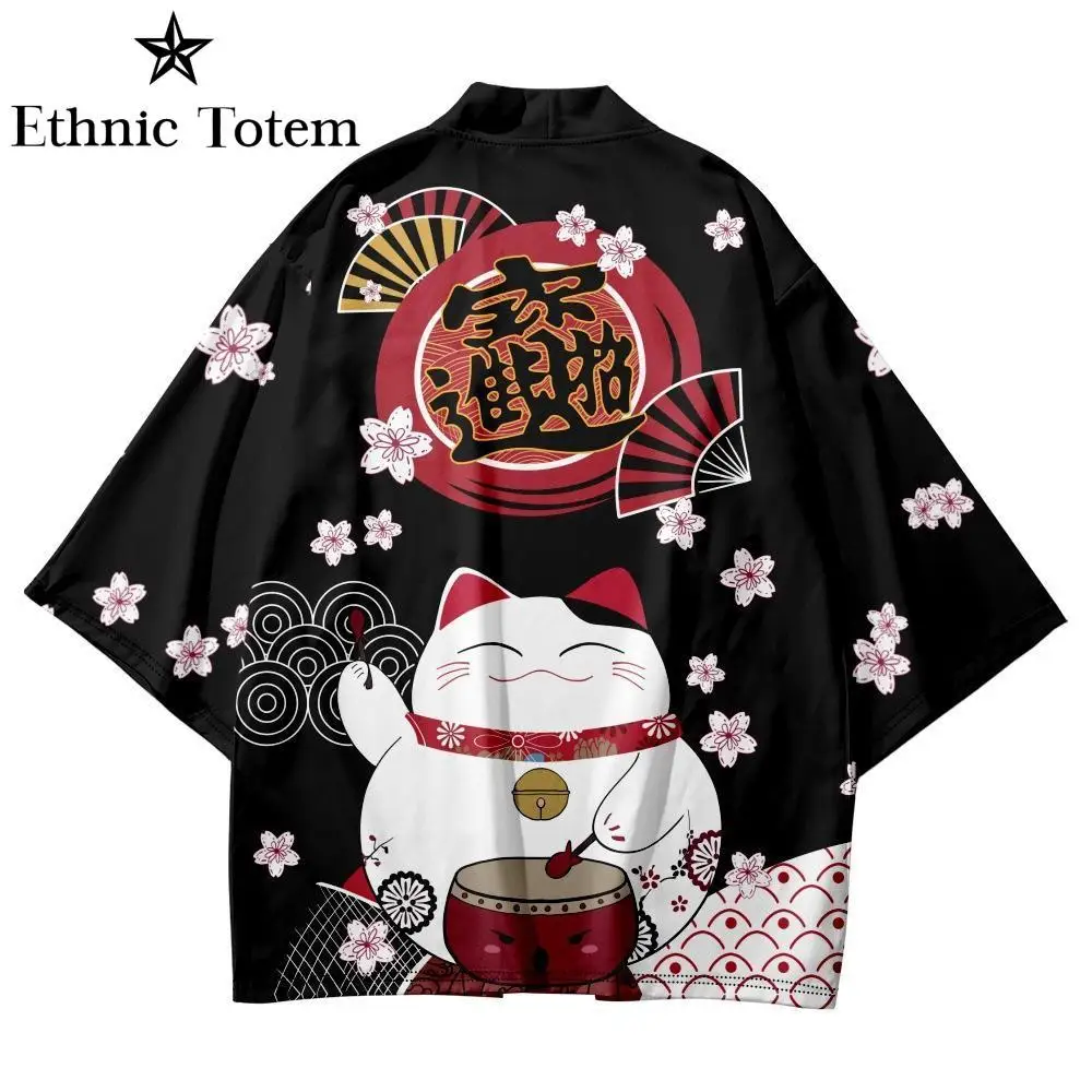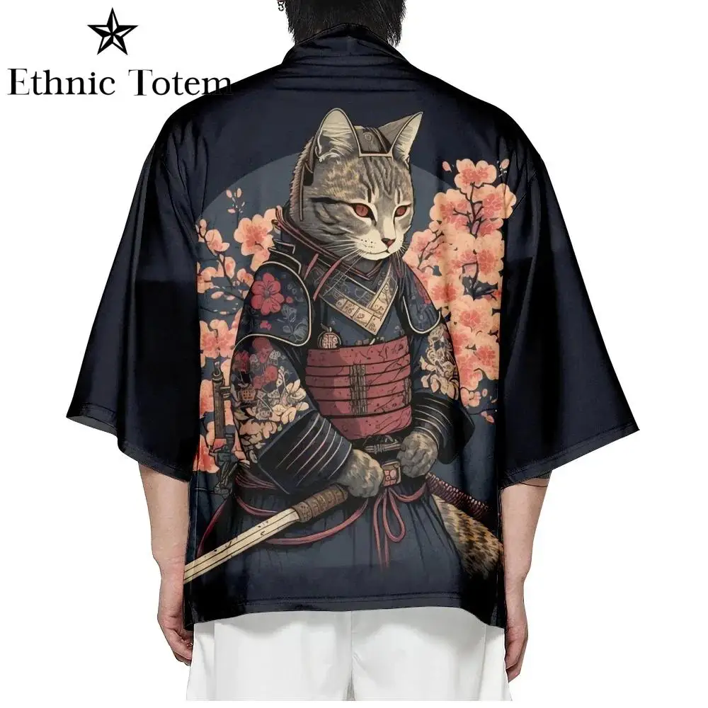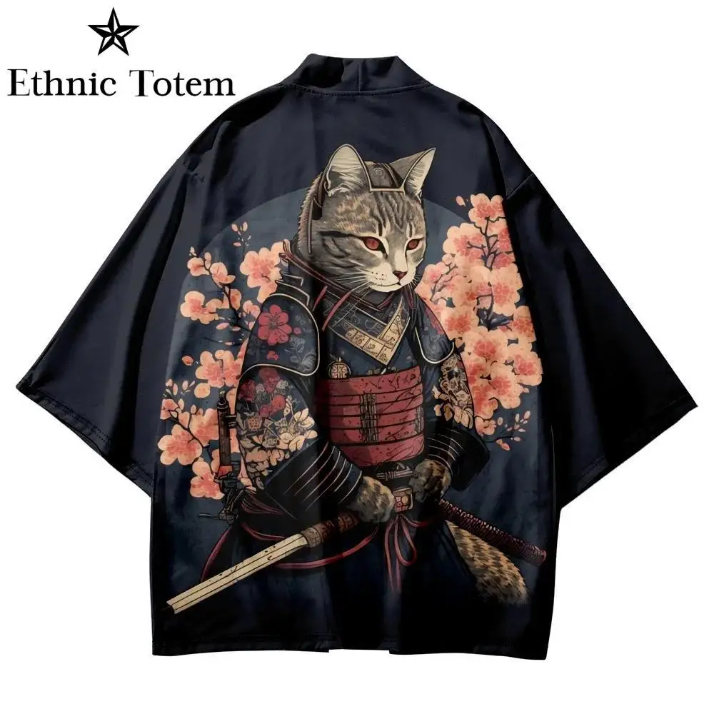 Kimono chat japonais pour hommes et femmes, cardigan à motif de samouraï, vêtements traditionnels Harajuku, vêtements de plage d’été Haori
