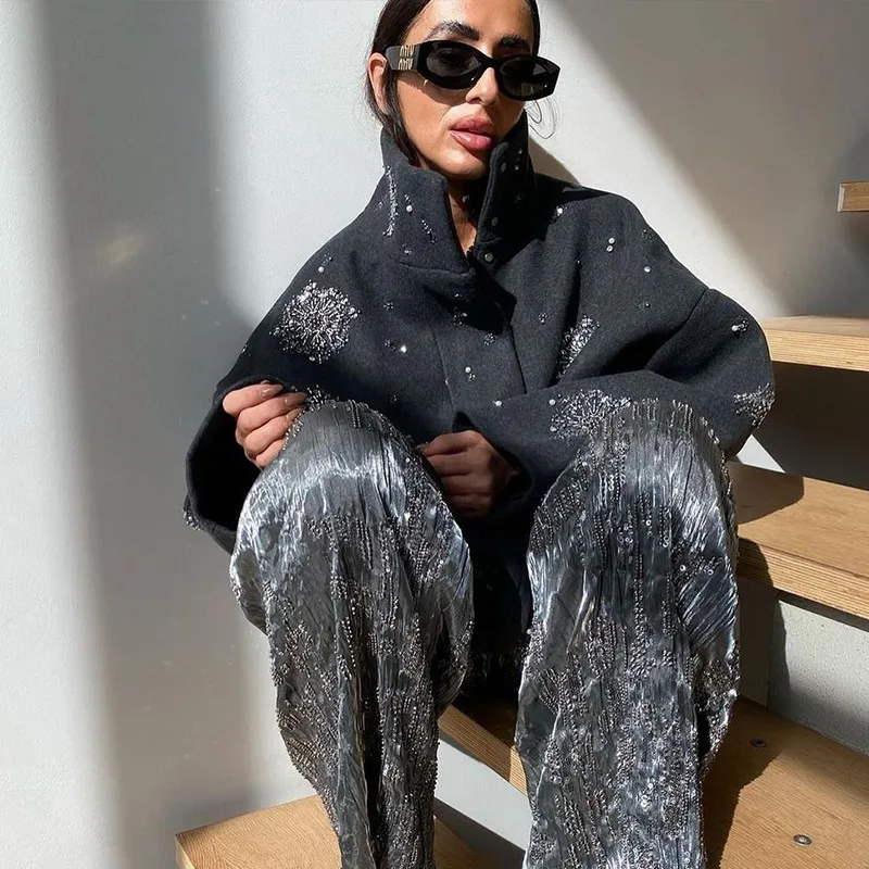 Manteau chic luxueux à perles pour femmes, vêtements d’extérieur en laine, vestes à manches longues, simple boutonnage, col rabattu, poche, automne, 2024