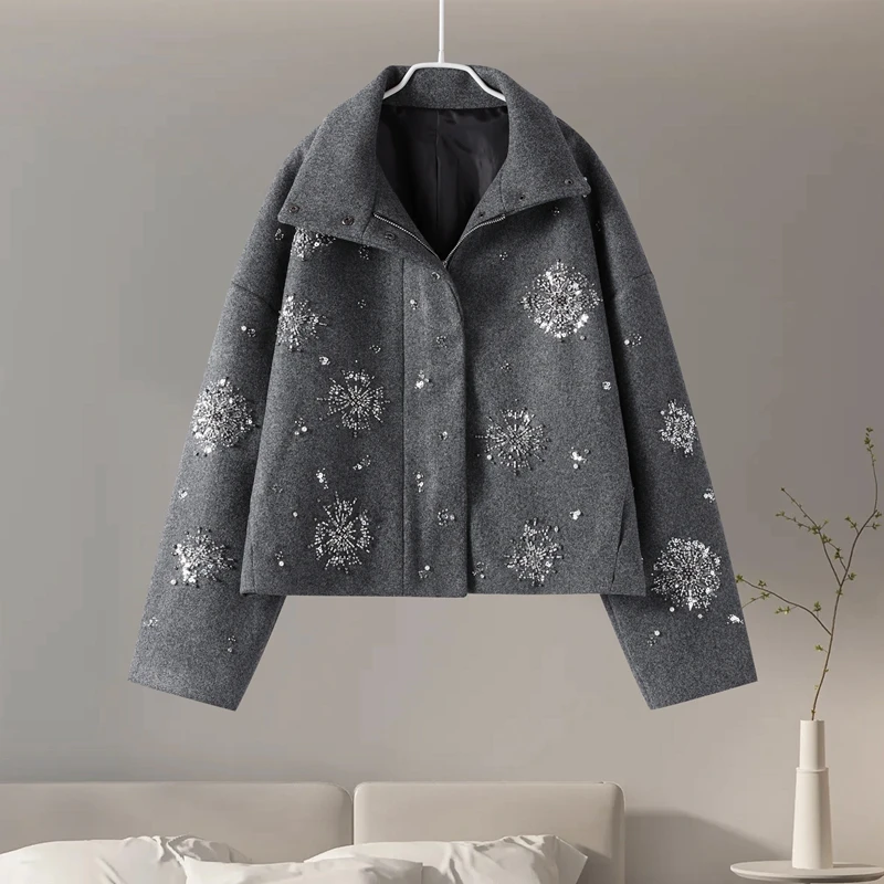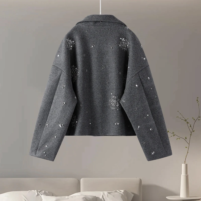 Manteau chic luxueux à perles pour femmes, vêtements d'extérieur en laine, vestes à manches longues, simple boutonnage, col rabattu, poche, automne, 2024 |