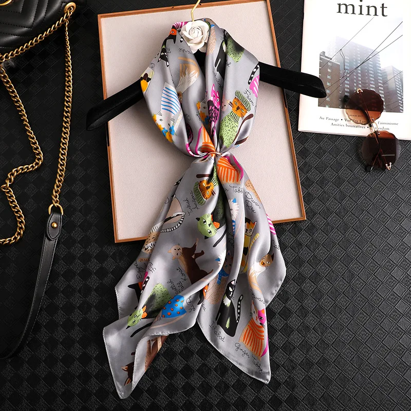 Marque de luxe 2022 nouvelle mode été soie carré Foulard femmes chat P Satin cou cheveux cravate bande plage Hijab tête femme Foulard |
