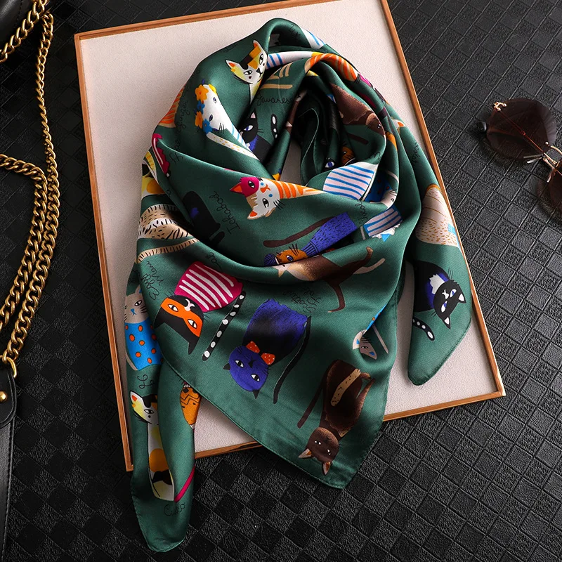 Marque de luxe 2022 nouvelle mode été soie carré Foulard femmes chat P Satin cou cheveux cravate bande plage Hijab tête femme Foulard