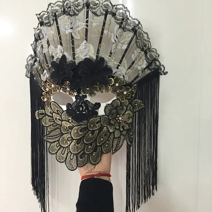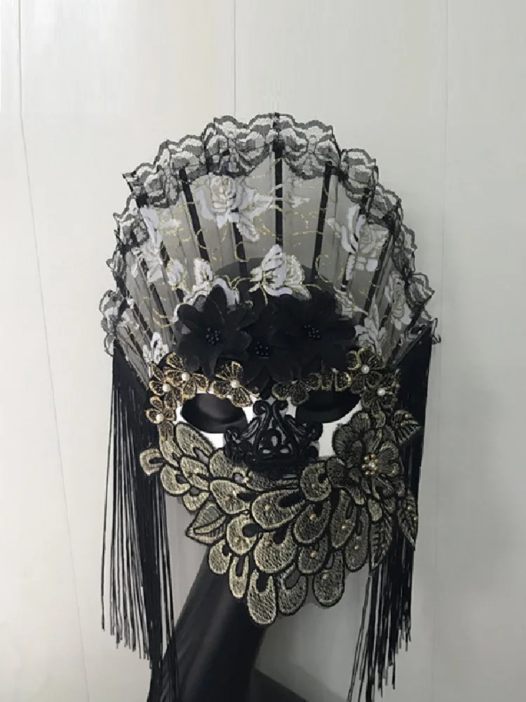 Masque complet noir mystérieux de Venise, masque de voile de fan de spectacle sur scène