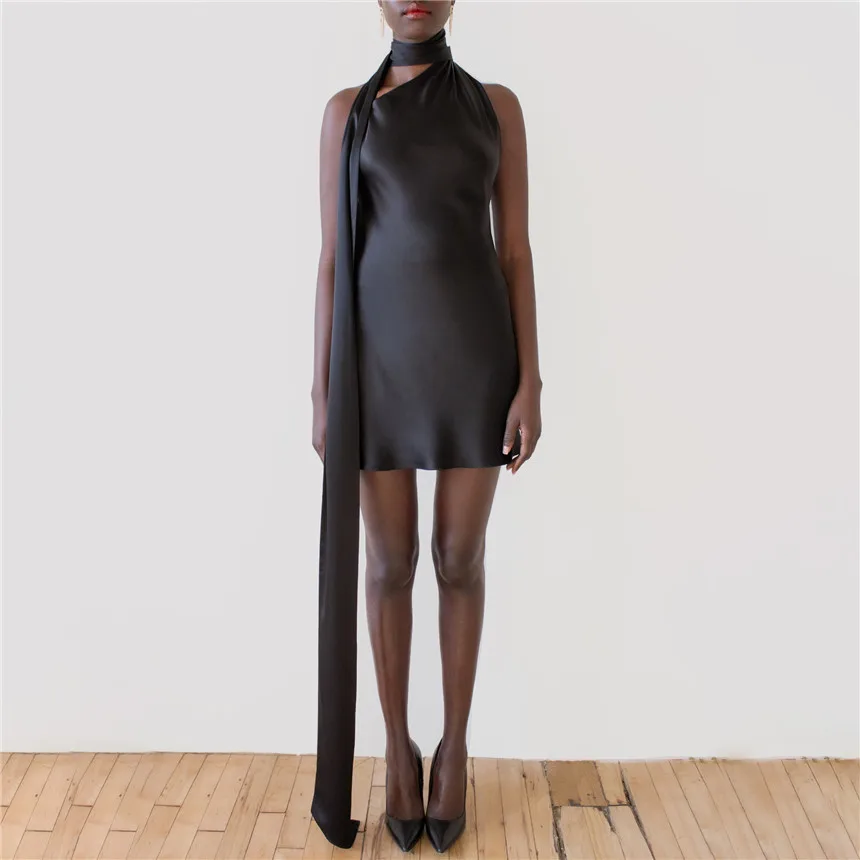 Mini robe en satin monochromatique élégante pour femmes, robe ruban à une épaule, col licou, sans manches, taille haute, dos nu, nouveauté |