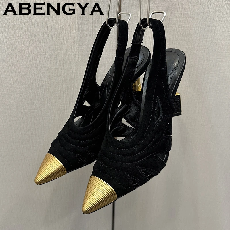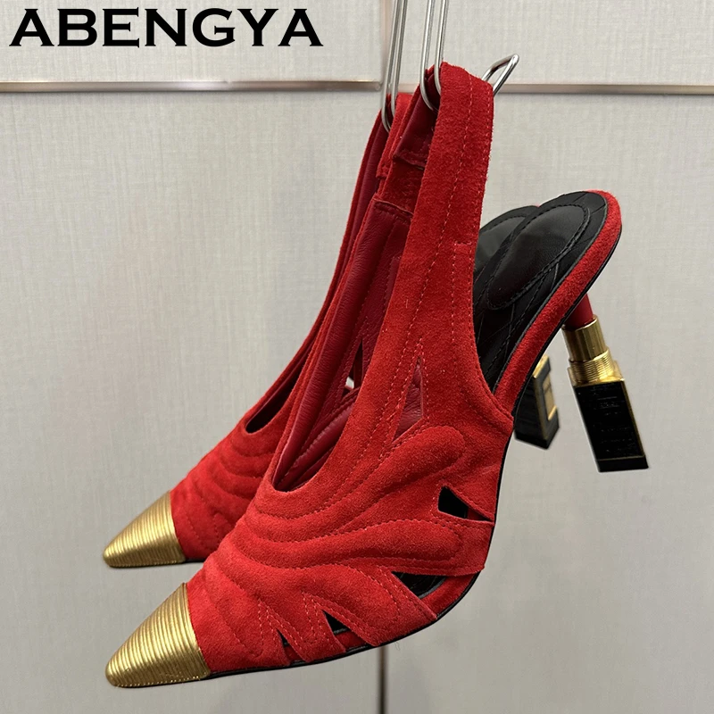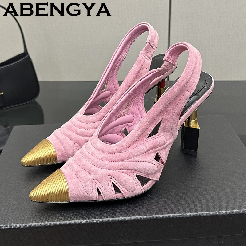 Mode étrange talons hauts sandales femmes métal bout pointu daim Slingbacks pompes été Sexy fête mariage mariées chaussures femme |