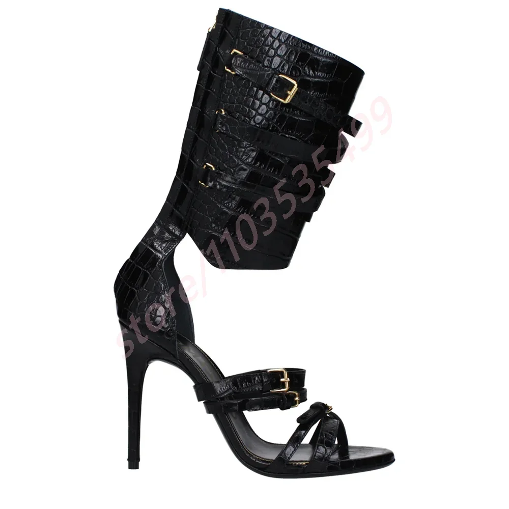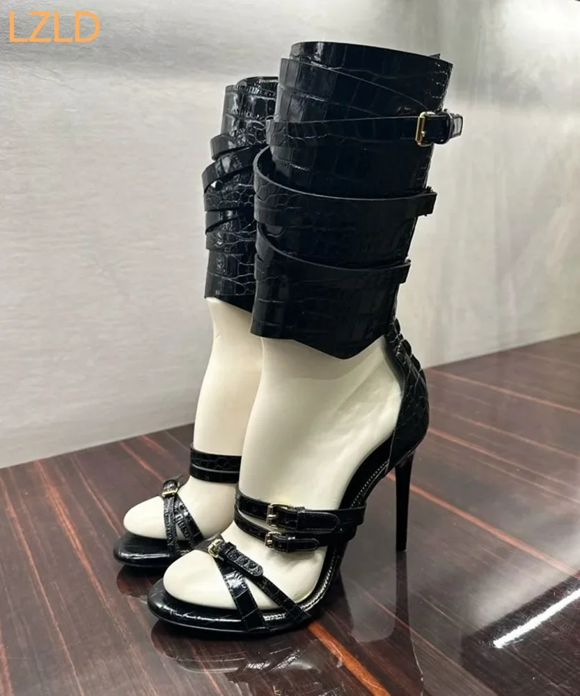 Noir Sexy Catwalk femmes sandales 2025 nouveau bout ouvert croix ceinture boucle talons aiguilles rue mode fête scène longues sandales |