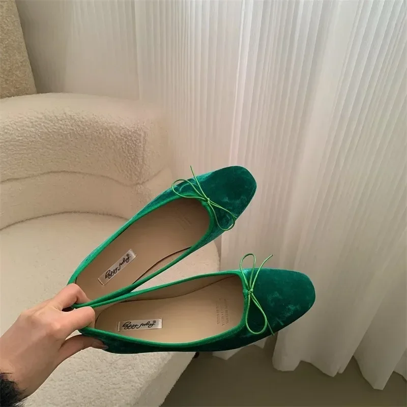Nouveau Style de mode élégant velours ballerine chaussures femme luxe velours ballerines dames rétro bout rond nœud papillon peu profond mocassins