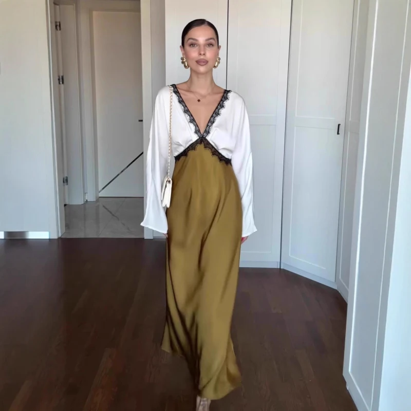 Nouvelle mode Satin femmes robe élégante décontracté contraste couleur dentelle Patchwork à manches longues col en V femmes robe |
