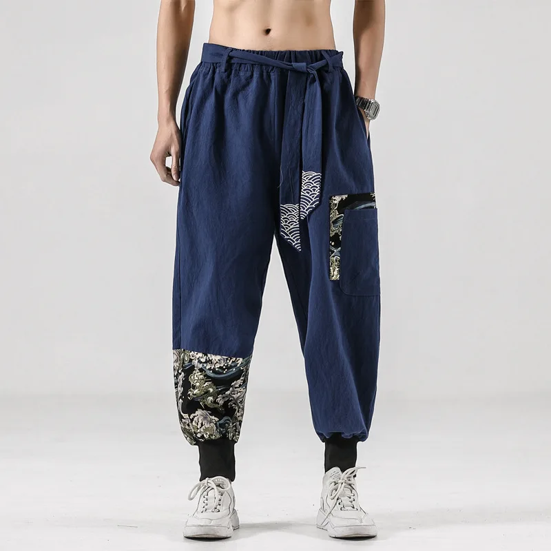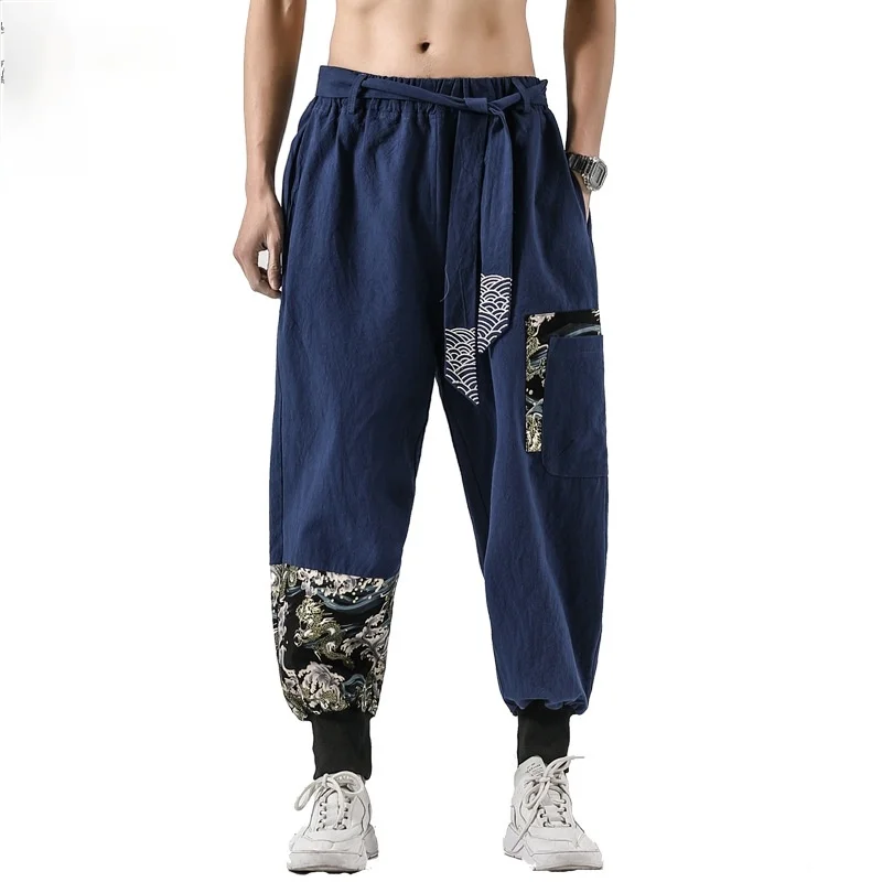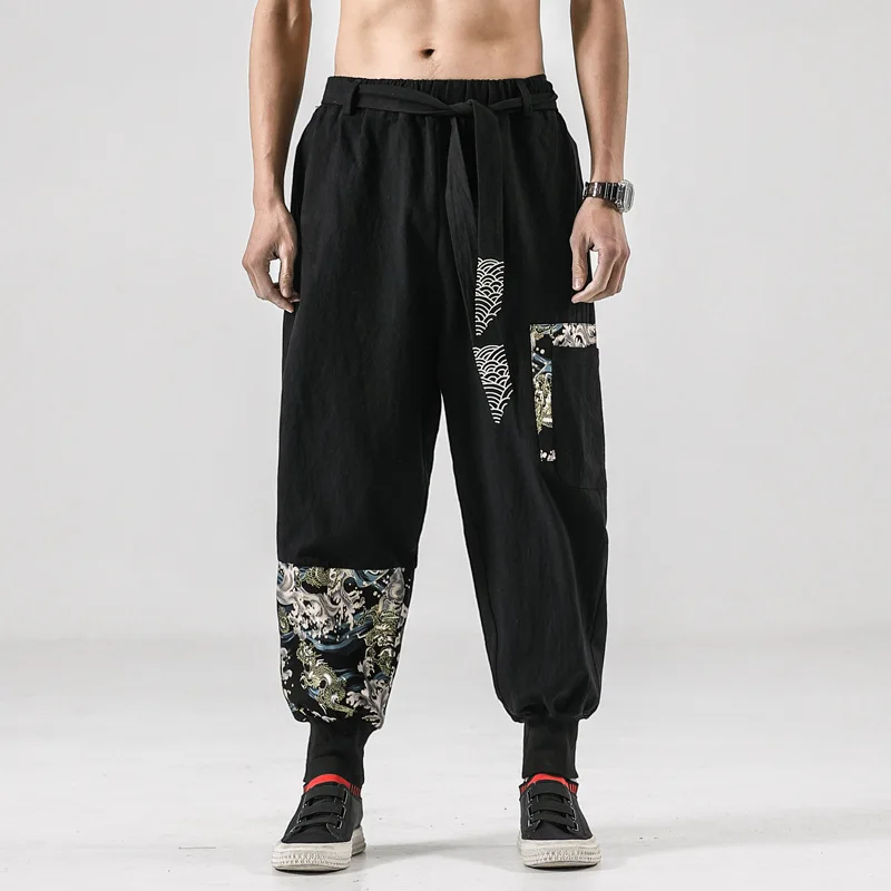 Pantalon Kimono Japonais en Coton et Lin pour Homme, Costume de Samouraï, Imprimé Rétro, Ceinture, Haori At Fjj Hip Hop |