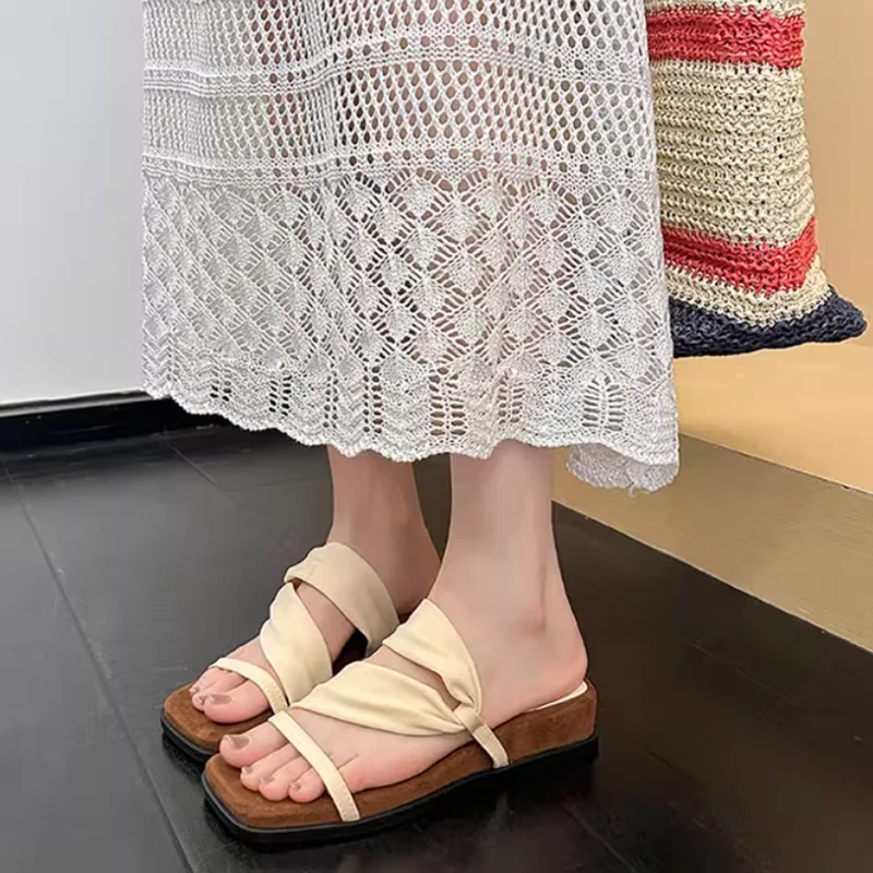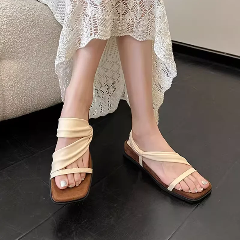 Pantoufles à fond plat pour femmes, couleur unie, bande étroite, sandales à bout ouvert, chaussures d’été pour loisirs en plein air, vacances, chaussures de fête