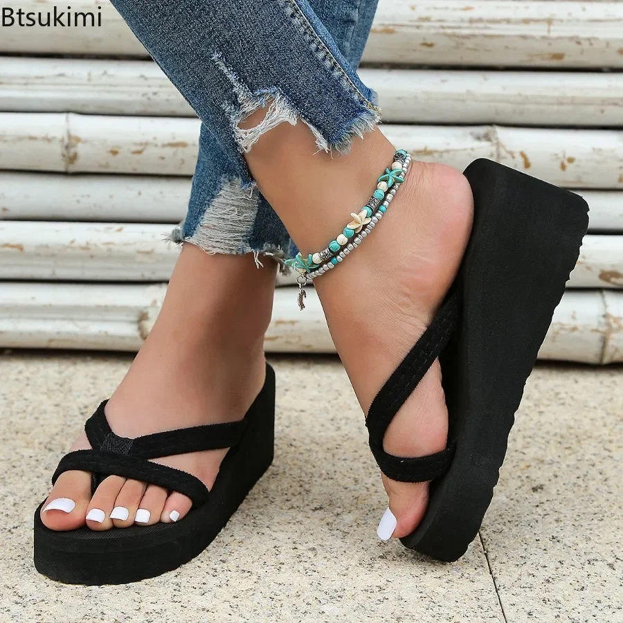 Pantoufles compensées pour femmes, sandales à talons hauts et bout ouvert, chaussures de plage décontractées d'été, semelle épaisse, confortables, diapositives d'extérieur, tongs à la mode |