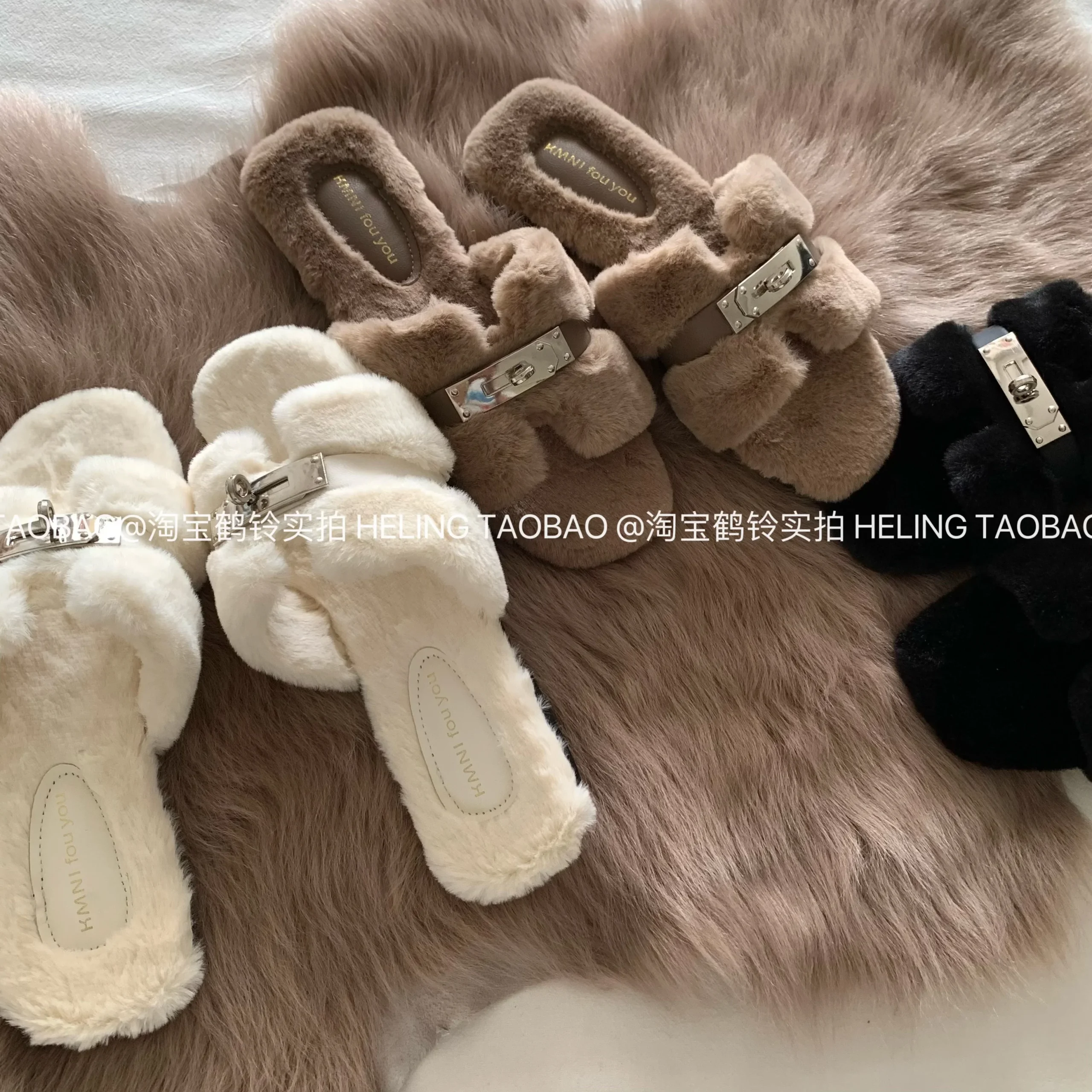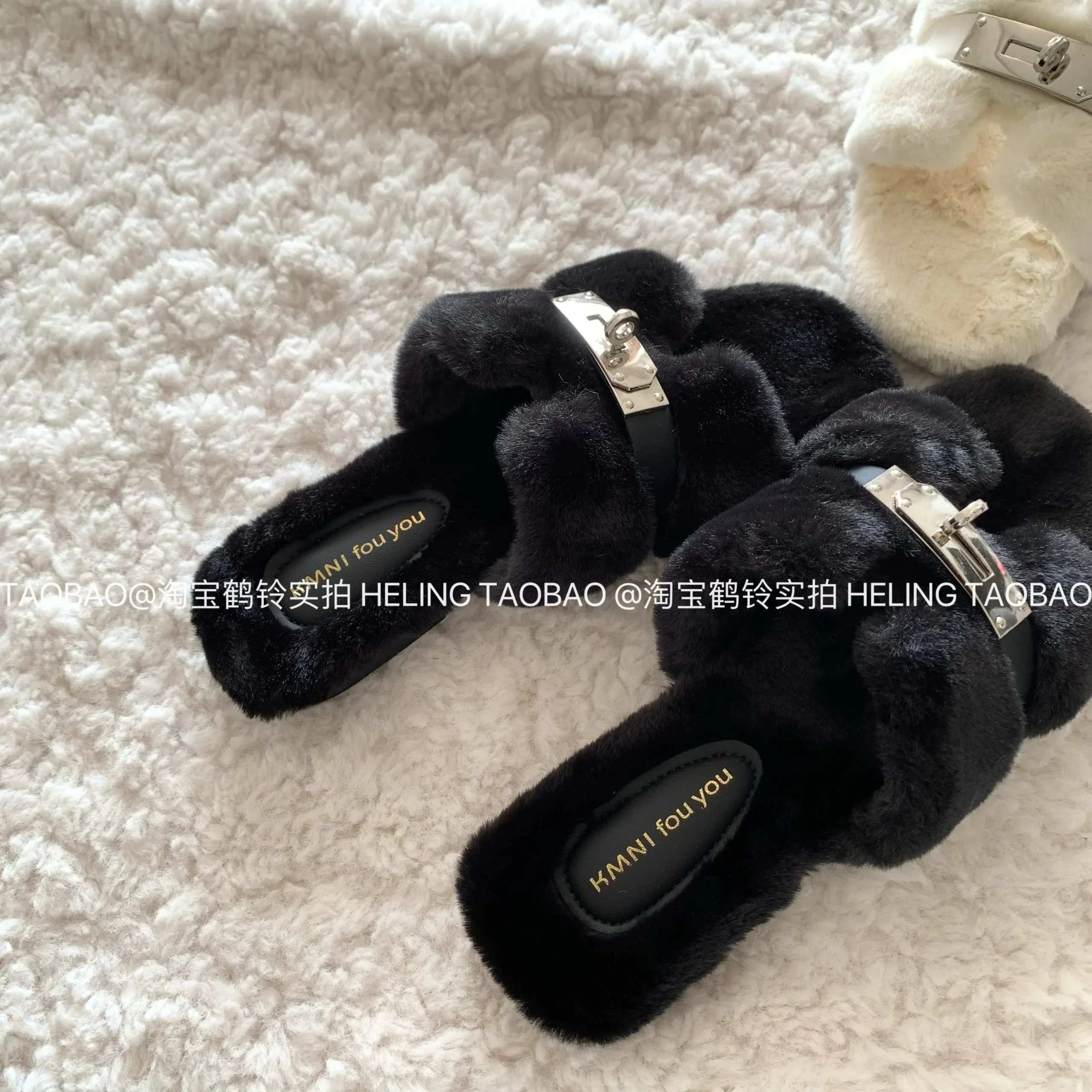 Pantoufles en fourrure élégantes pour femmes, chaussures plates chaudes et moelleuses, sandales d'intérieur pour la maison, chaussures haut de gamme, nouvelle mode, 2025 |