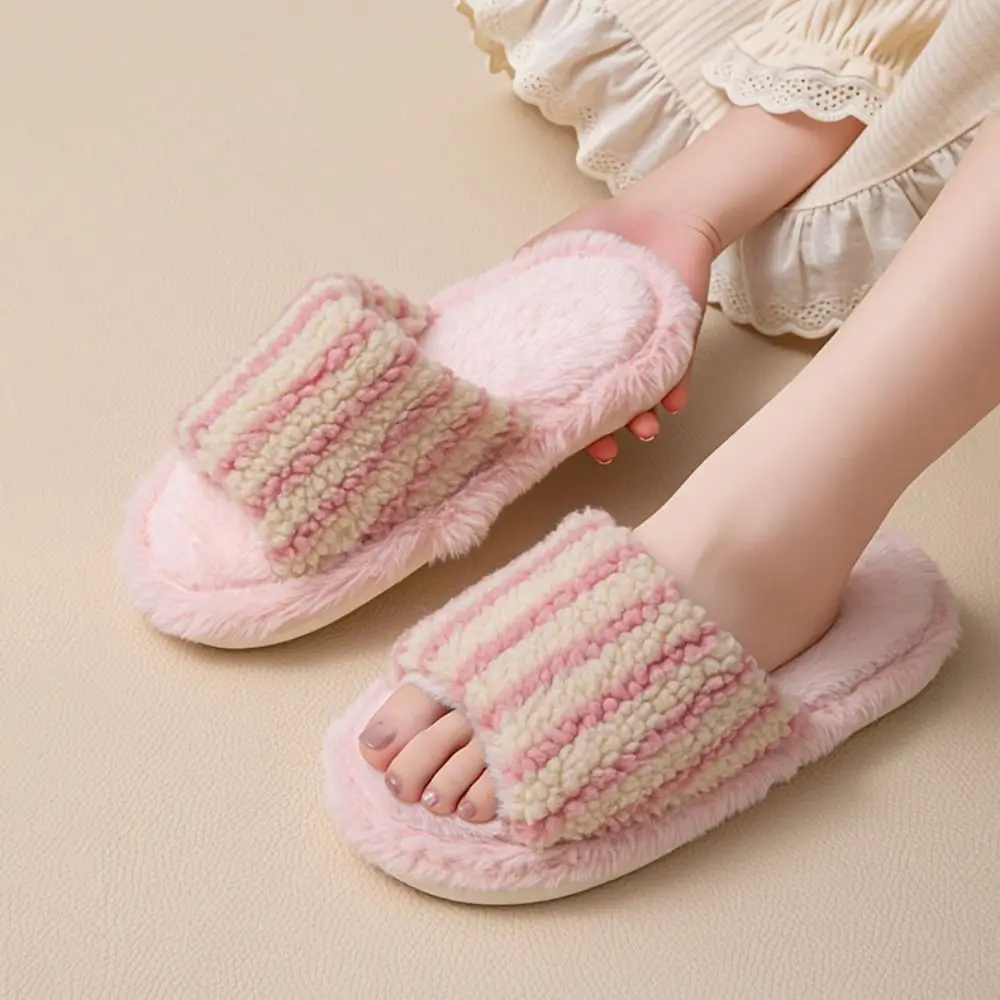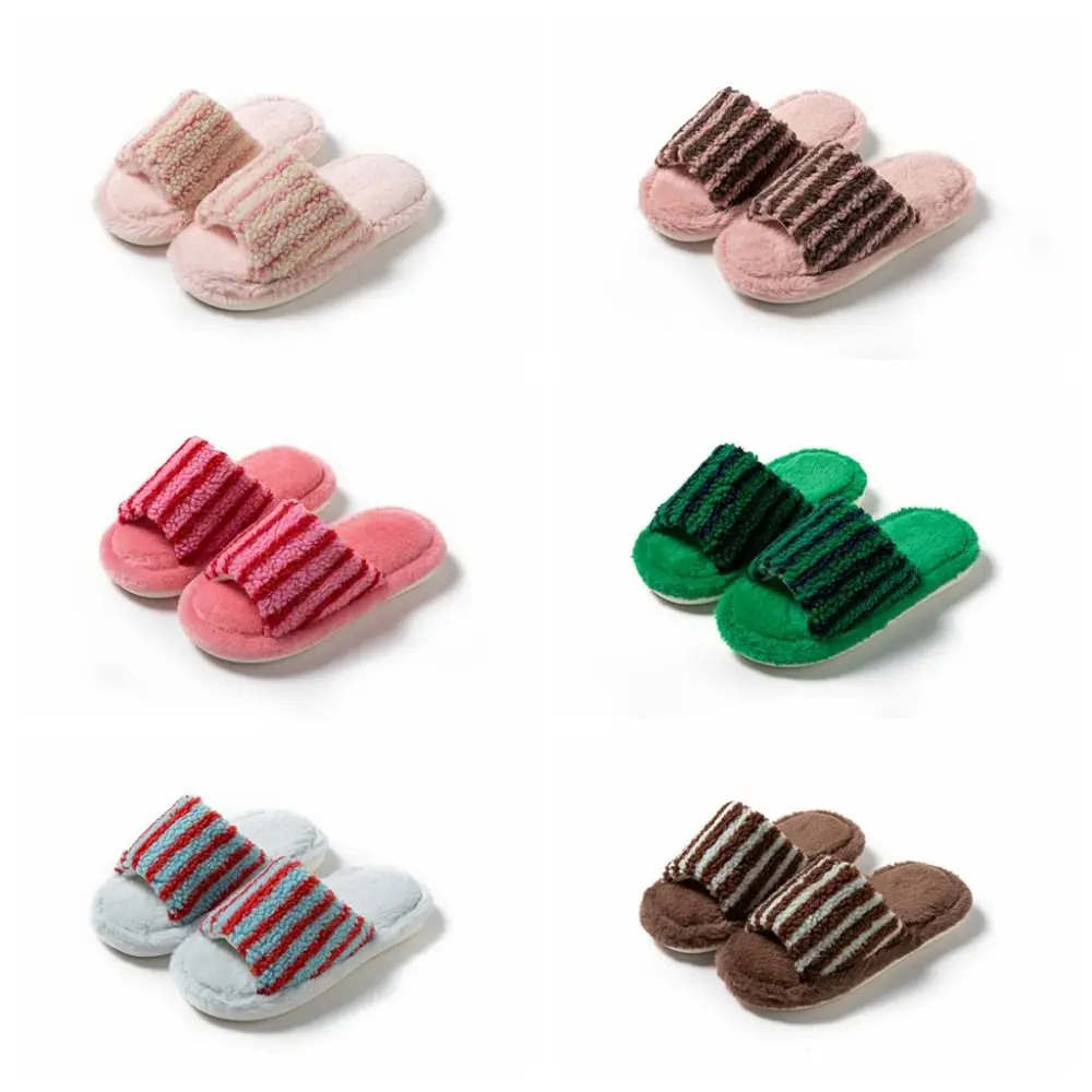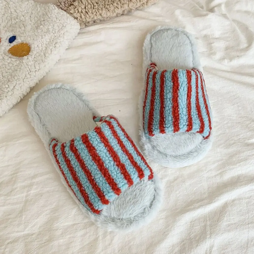 Pantoufles en peluche décontractées à rayures confortables, chaussures en coton doux pour la maison, chaudes et antidérapantes, plates pour la maison, hiver