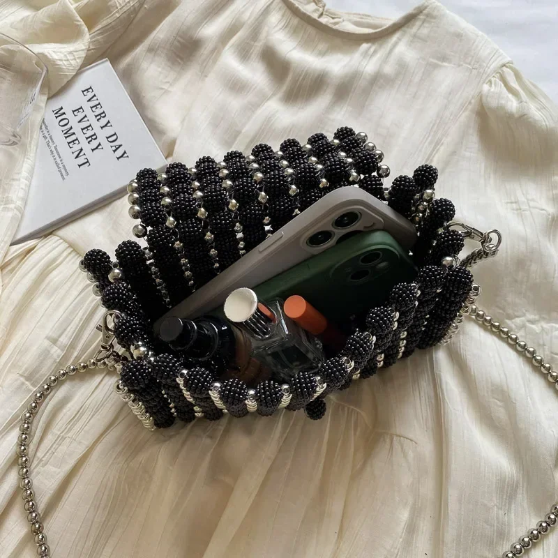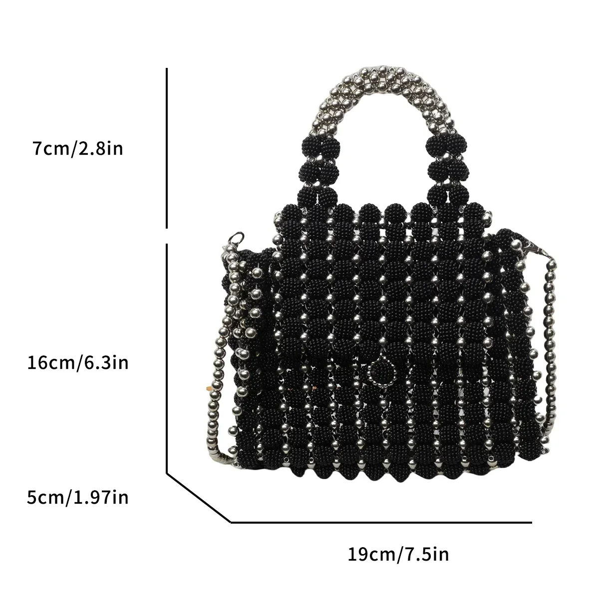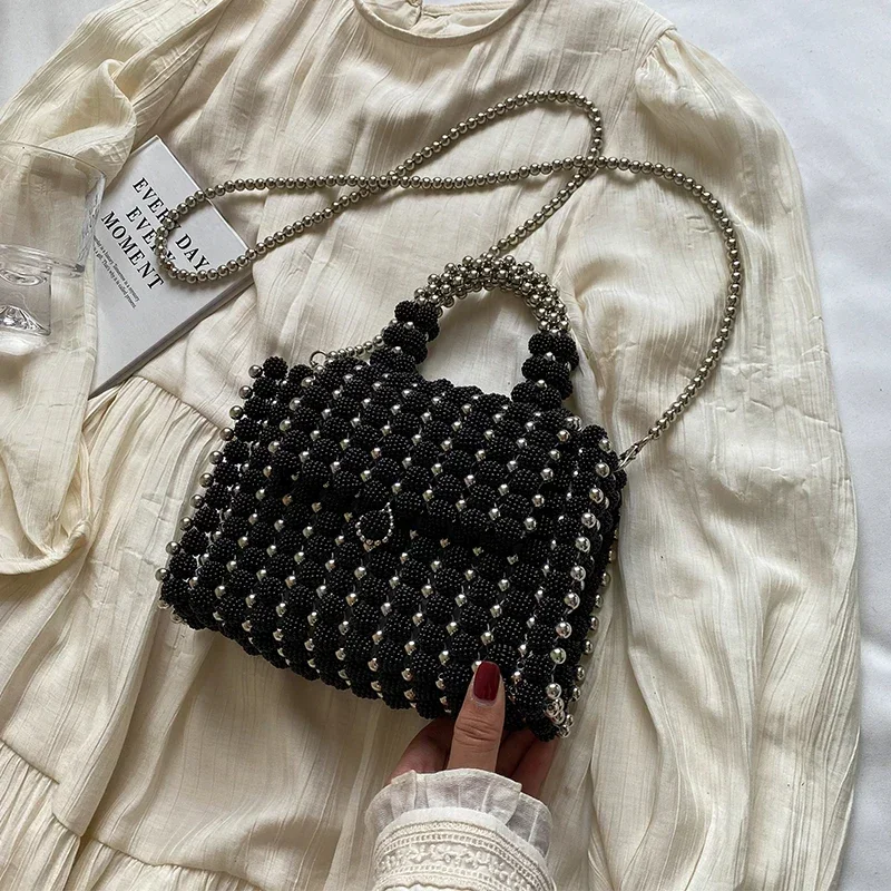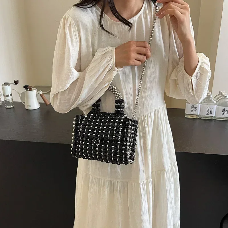 Petit sac à main carré noir pour femme, sac à bandoulière initié par perle, sac à main perlé vintage, sac à main pour téléphone, porte-monnaie, été 2024 |