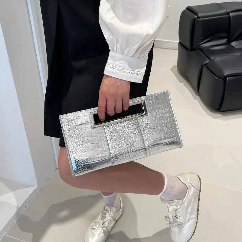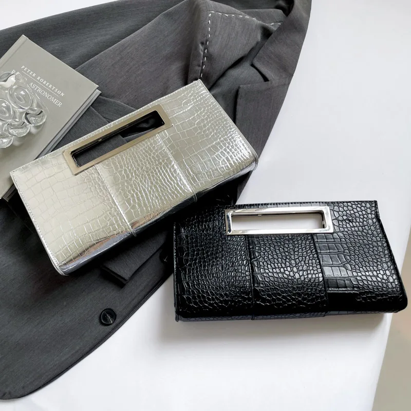Pochette de luxe en cuir PU Crocodile, pochette Chic noire, sacs de soirée, poignée en métal, fourre-tout moyen, sac à main enveloppe, sac de dîner de fête |
