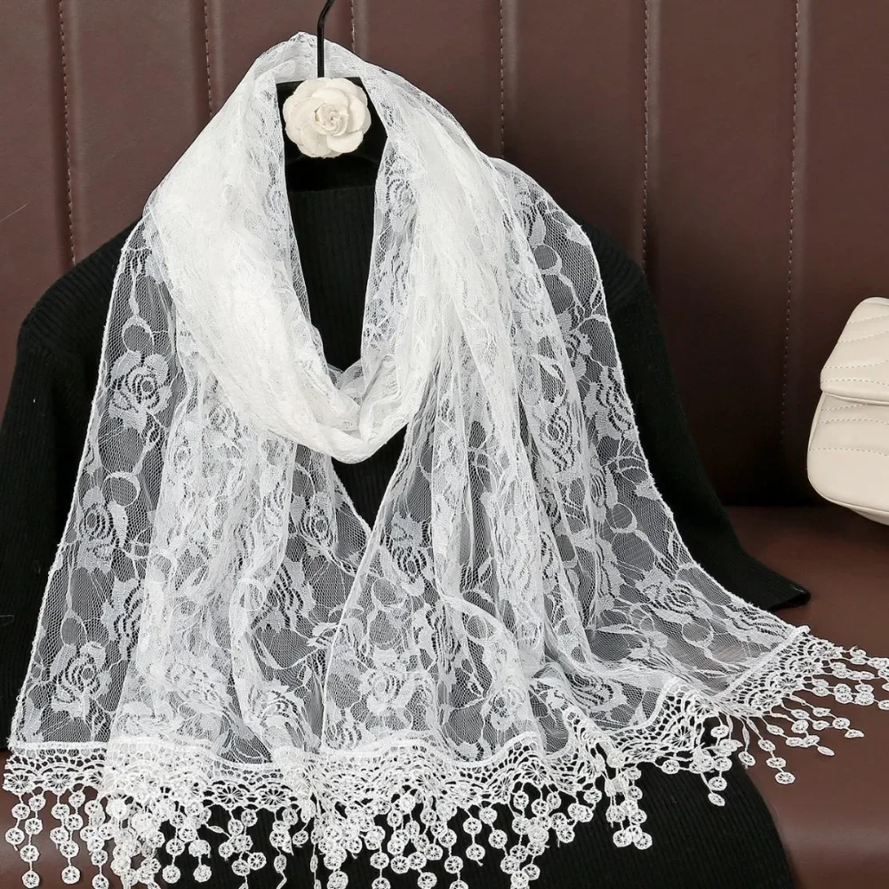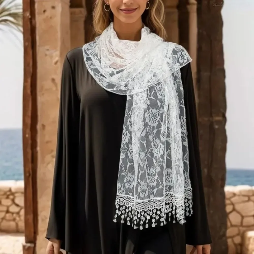 Polyvalent rétro dentelle glands écharpe longue Rose broderie femme Wrap châles couleur unie foulard voiles pour les femmes