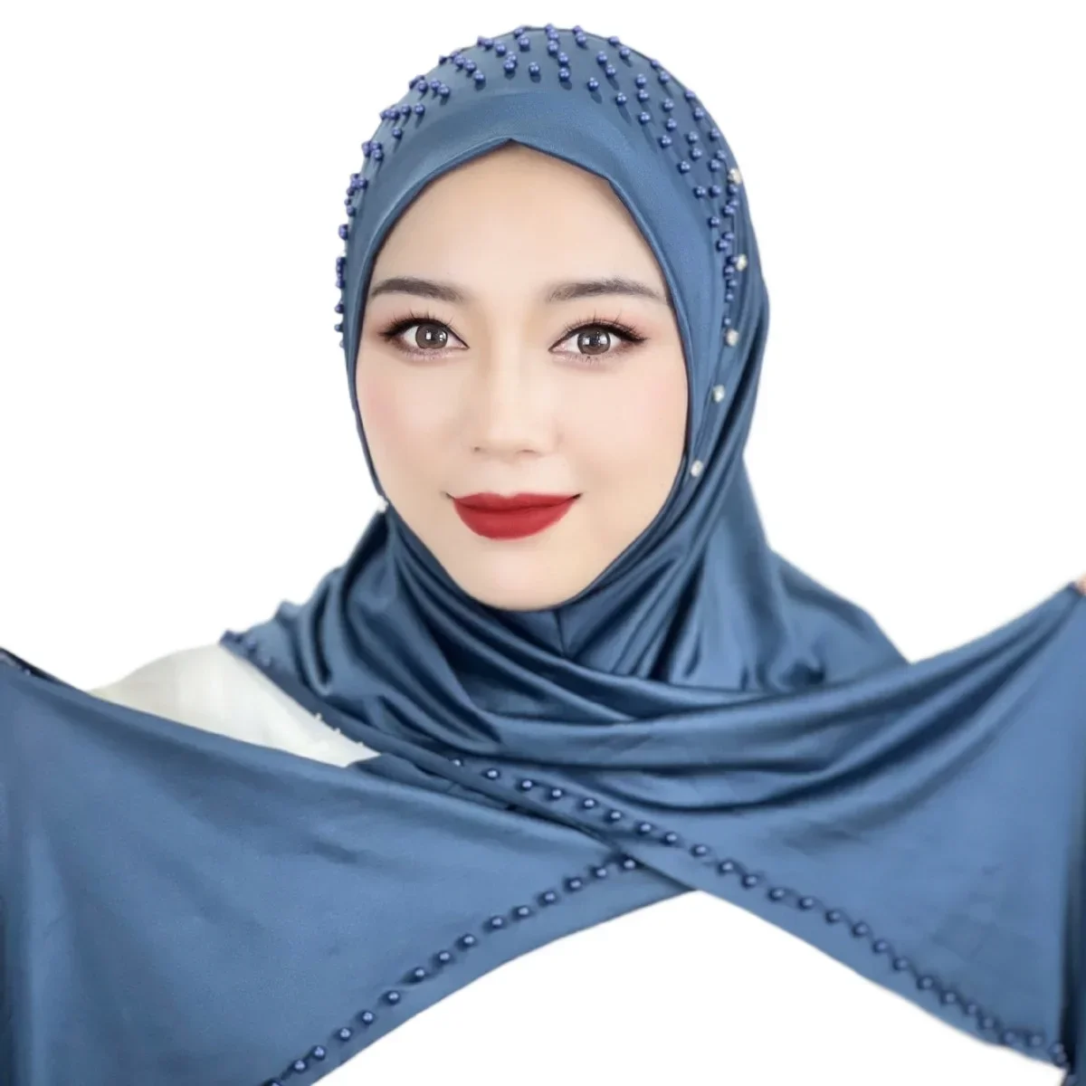 Pull Hijab instantané pratique, écharpe perlée, châle malais, foulard de couleur unie pour femmes (un bonnet cadeau) |