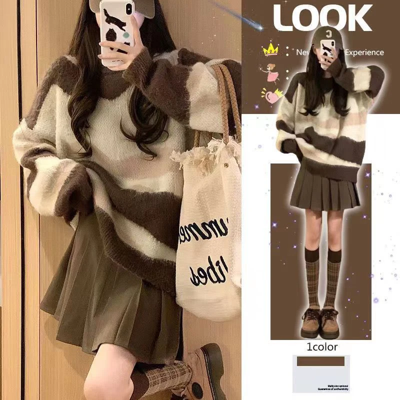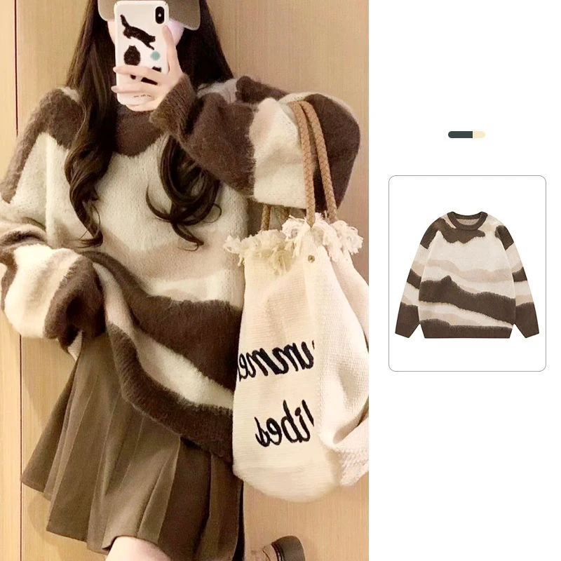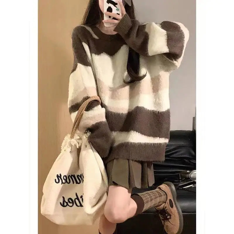 Pull rayé à panneaux patchwork paresseux pour femmes, haut en tricot à manches longues, col rond, style japonais, mode vintage, automne
