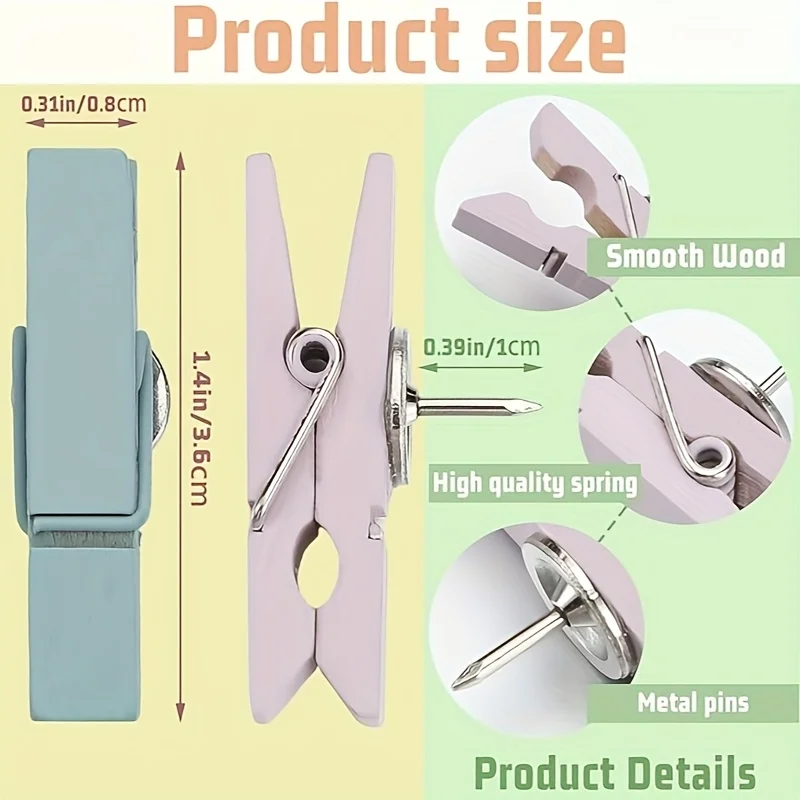 Punaises Pastel avec Clips en bois, 50 pièces, punaises colorées pour salle de classe, bureau, tableaux d’affichage à domicile | Punaises vibrantes