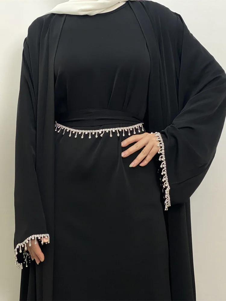Soyez le premier à laisser votre avis sur “Ramadan musulman Abaya Nida robe noire avec chaîne de cristal ensembles islamiques élégants dubaï longue femme robes de soirée Caftan marocain”