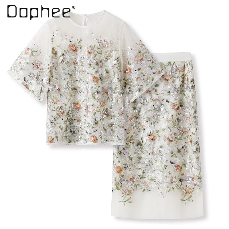 RapIndustry-Ensemble haut à manches courtes et jupe taille haute, broderie de fleurs, paillettes, tenues rétro de luxe légères, haut de gamme, 2 pièces |
