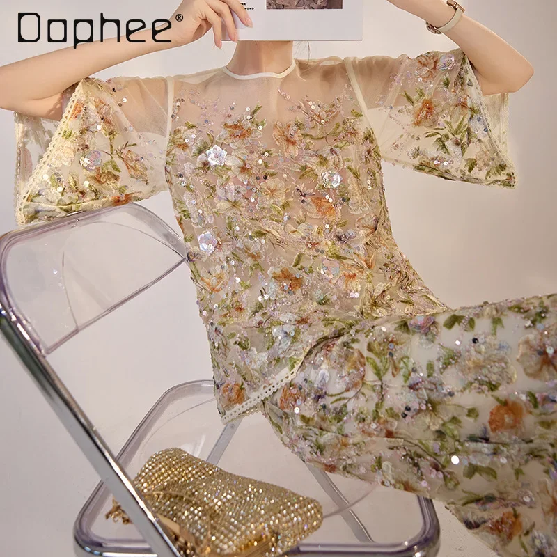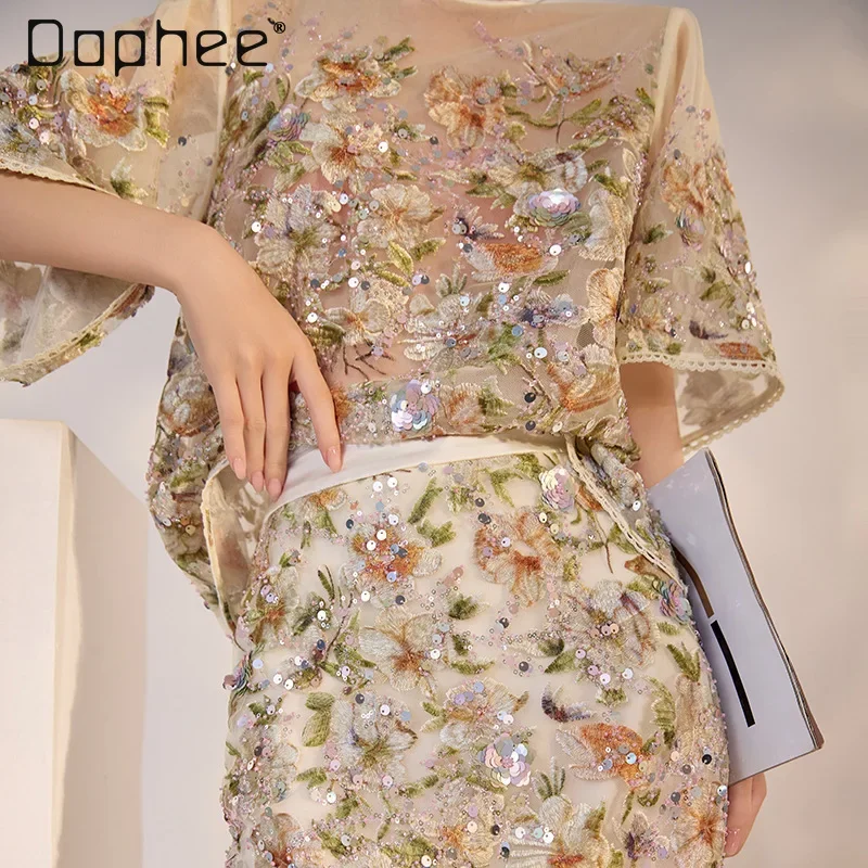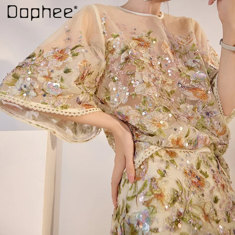 RapIndustry-Ensemble haut à manches courtes et jupe taille haute, broderie de fleurs, paillettes, tenues rétro de luxe légères, haut de gamme, 2 pièces