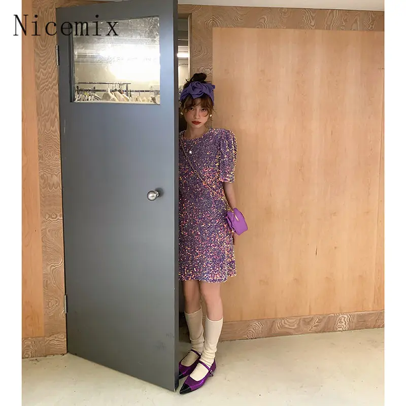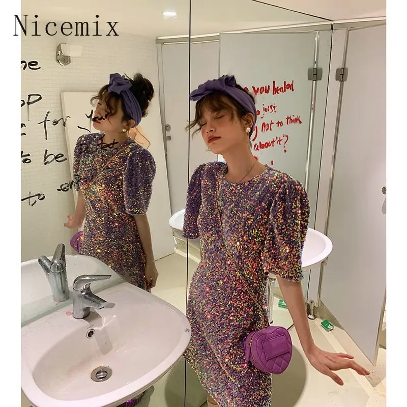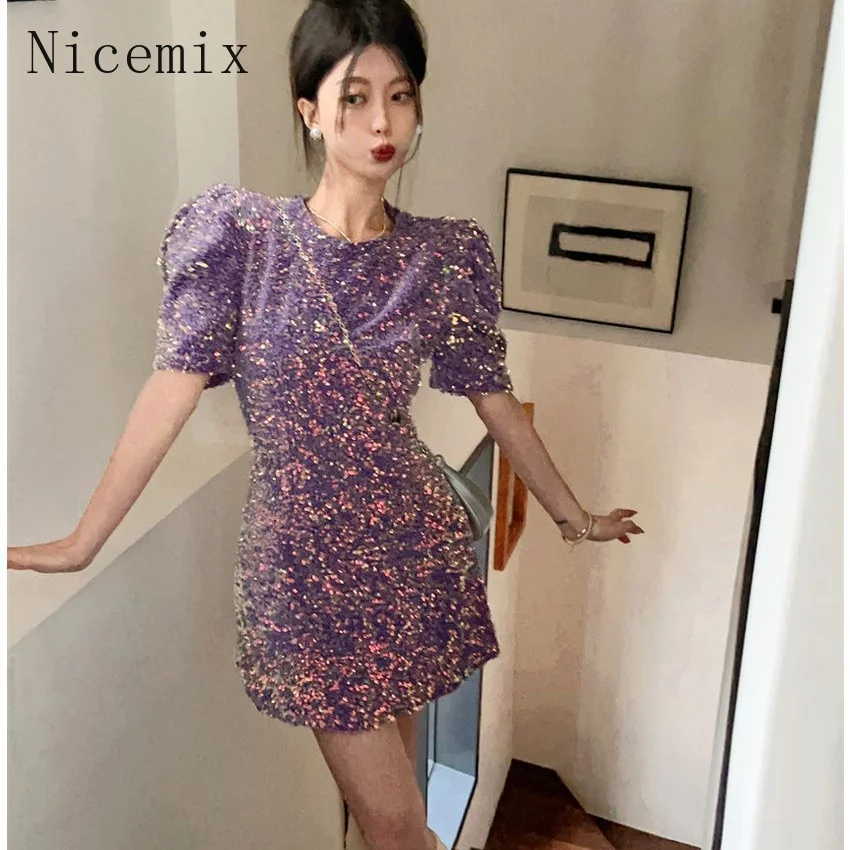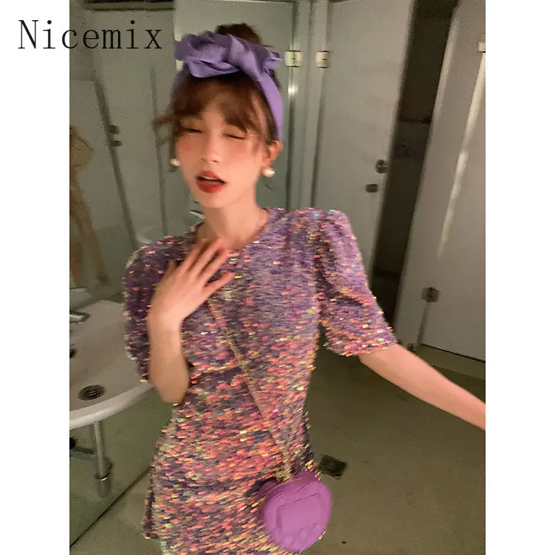 Robe à paillettes pour femmes, col rond, manches courtes, nouvelle mode française, taille haute, épicée, coupe cintrée, ligne a, printemps |