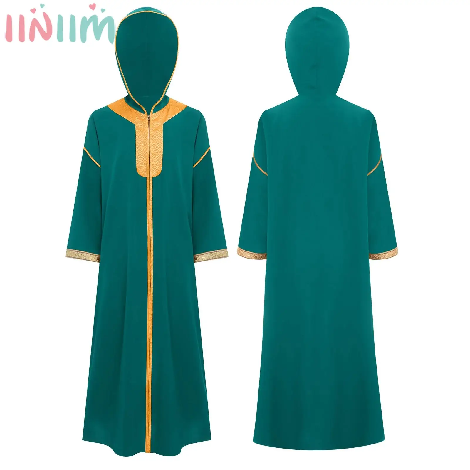 Robe Abaya musulmane pour enfants, manches longues, fermeture éclair, broderie dorée, à capuche, Kaftan, Robe arabe, Costume de prière islamique du moyen-orient |