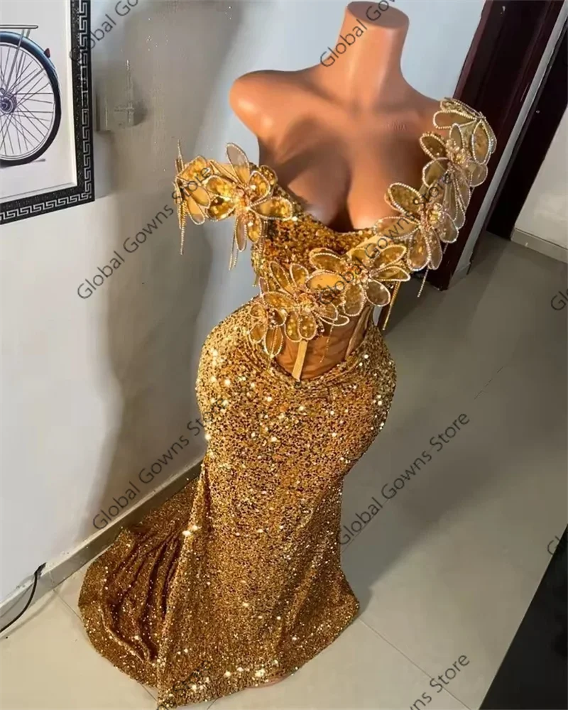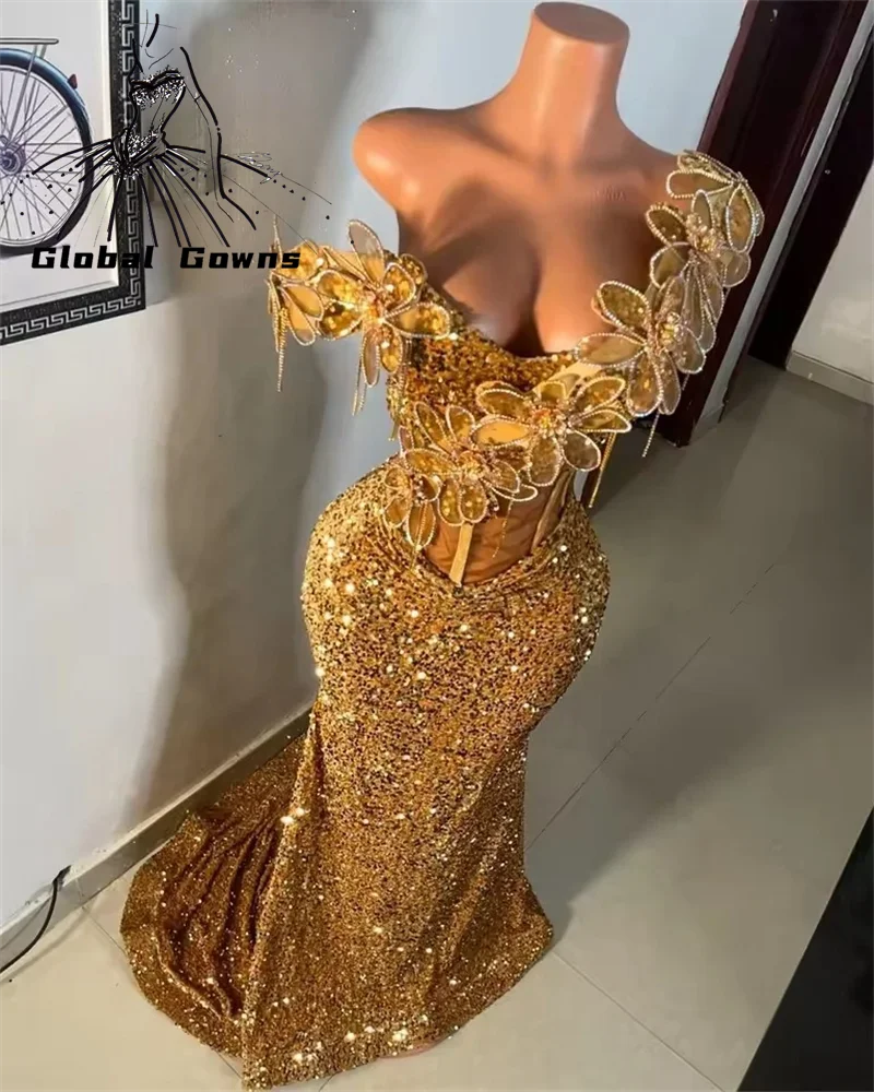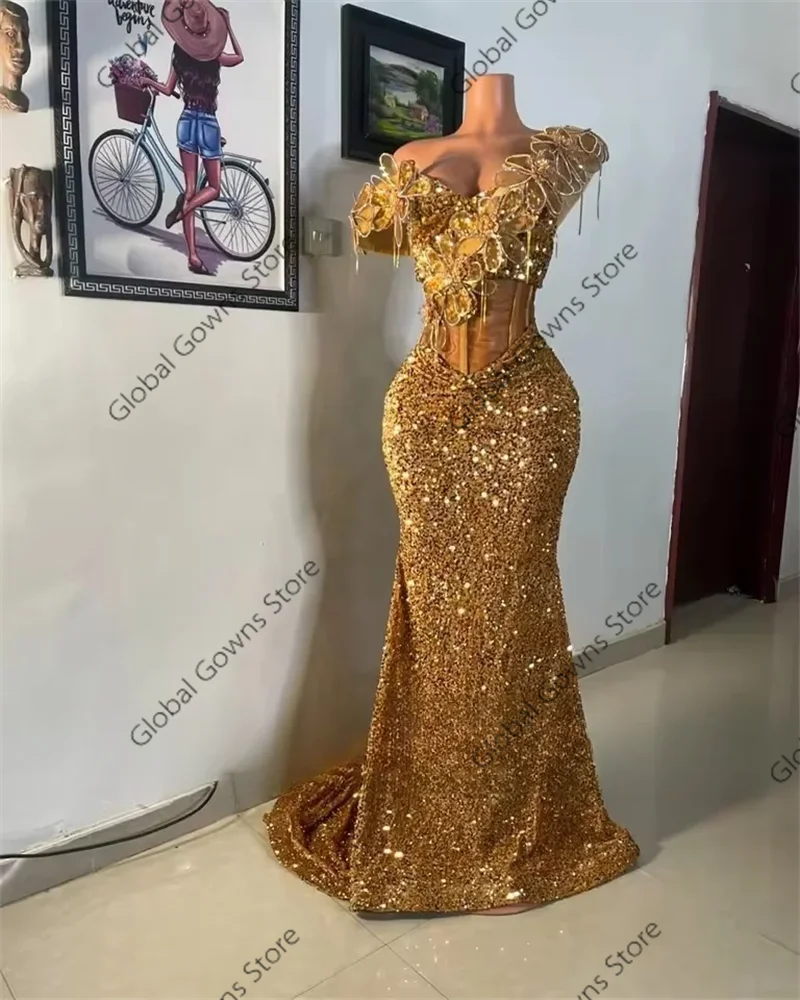 Robe de bal Aso Ebi dorée scintillante pour filles noires, épaules dénudées, avec des appliques de cristaux, robes de bal formelles à paillettes personnalisées |