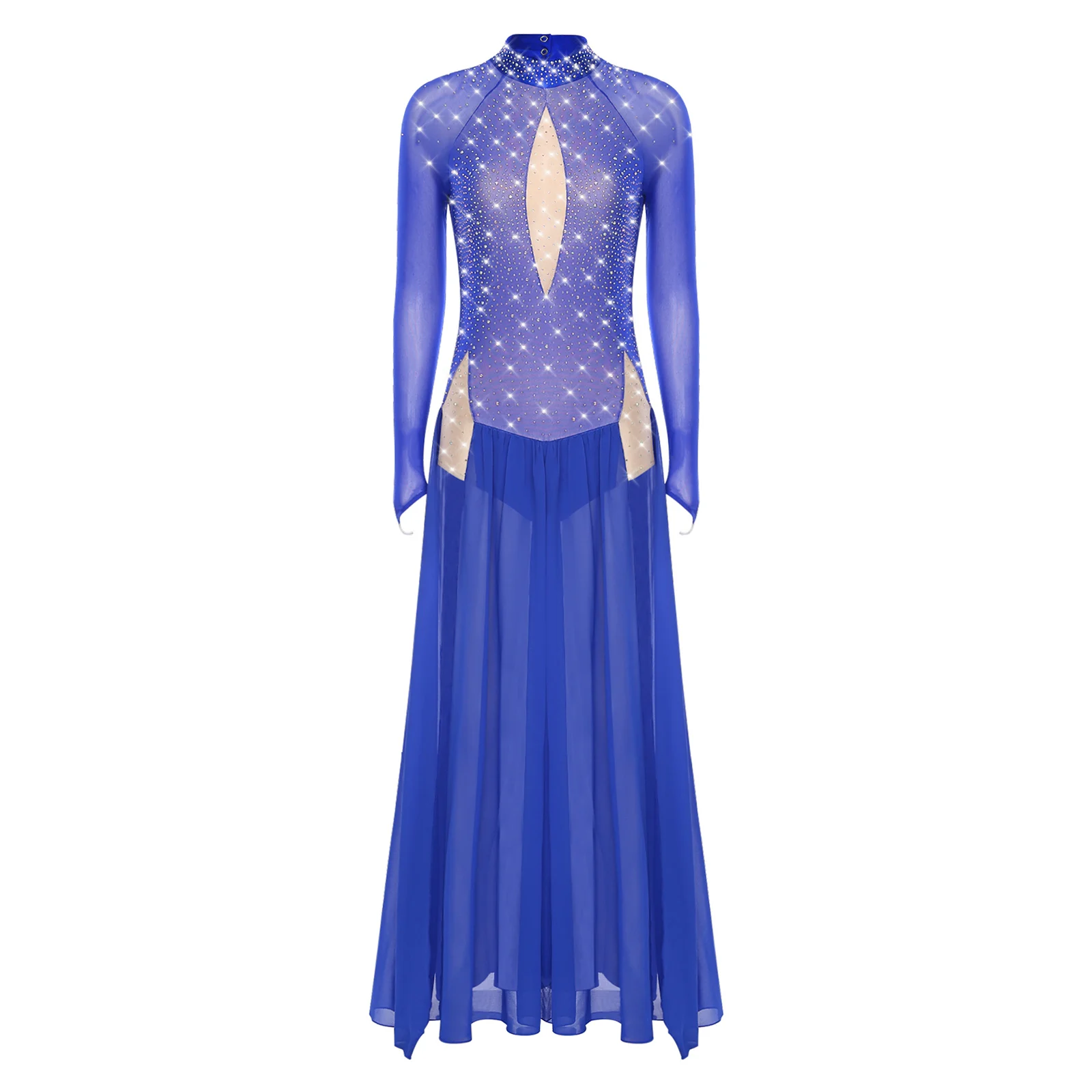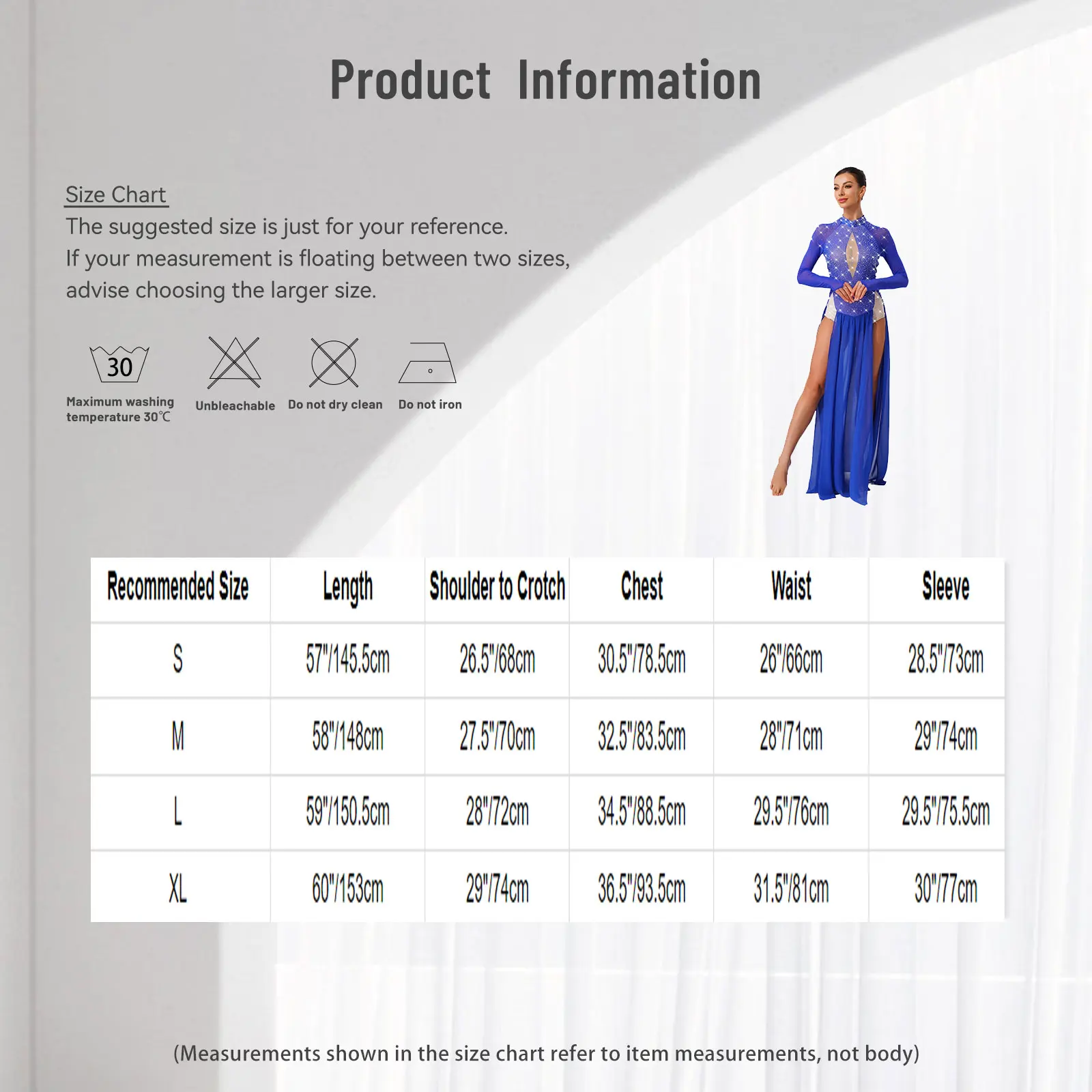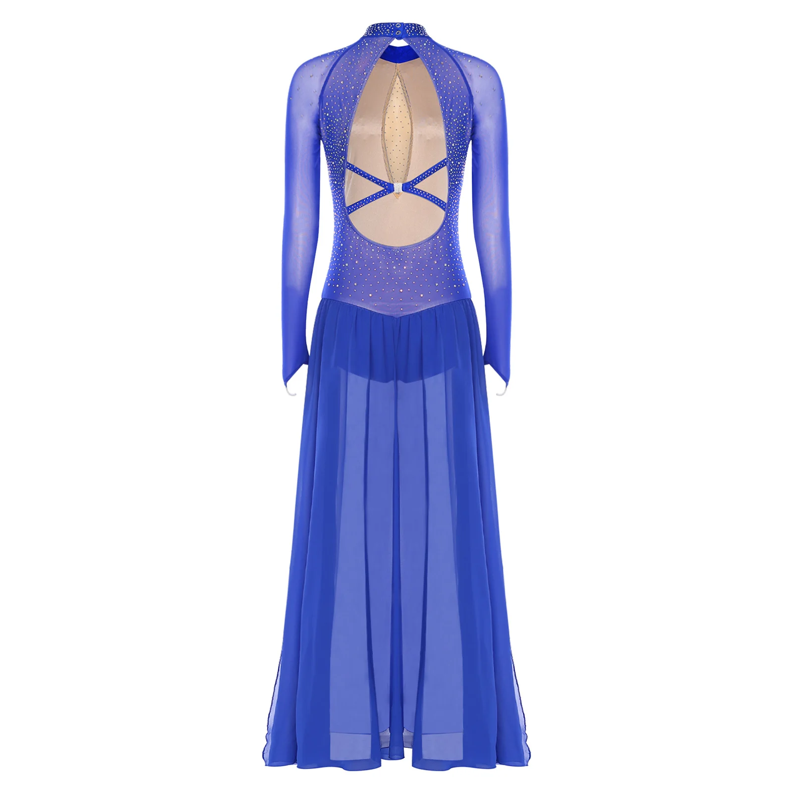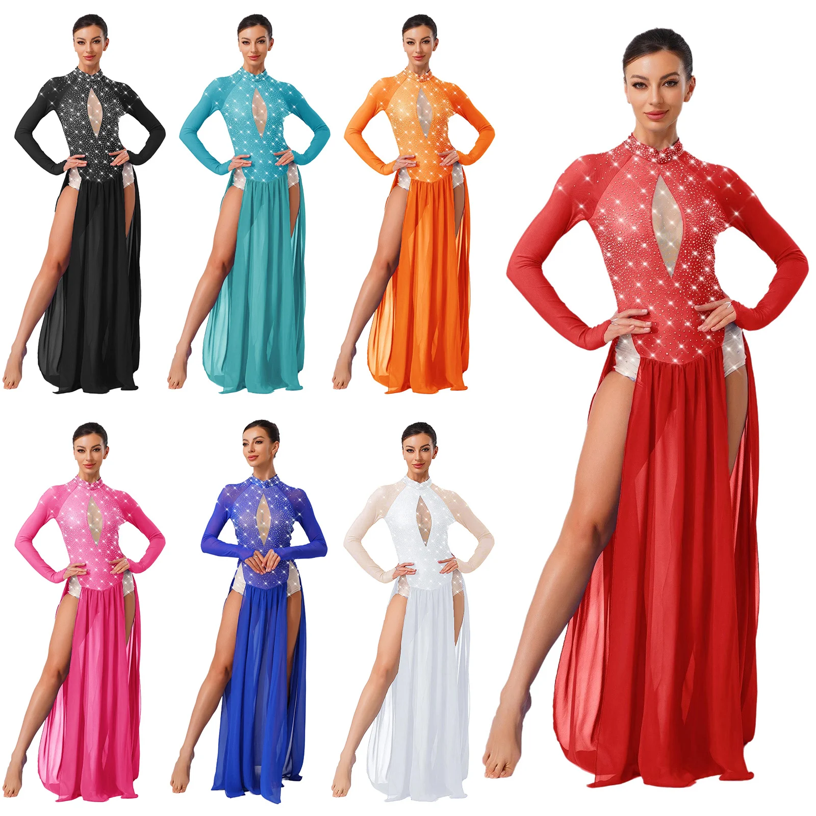 Robe de danse lyrique pour femmes, strass, manches longues, dos nu, fente en mousseline de soie, justaucorps de gymnastique, Costume de danse contemporaine moderne |