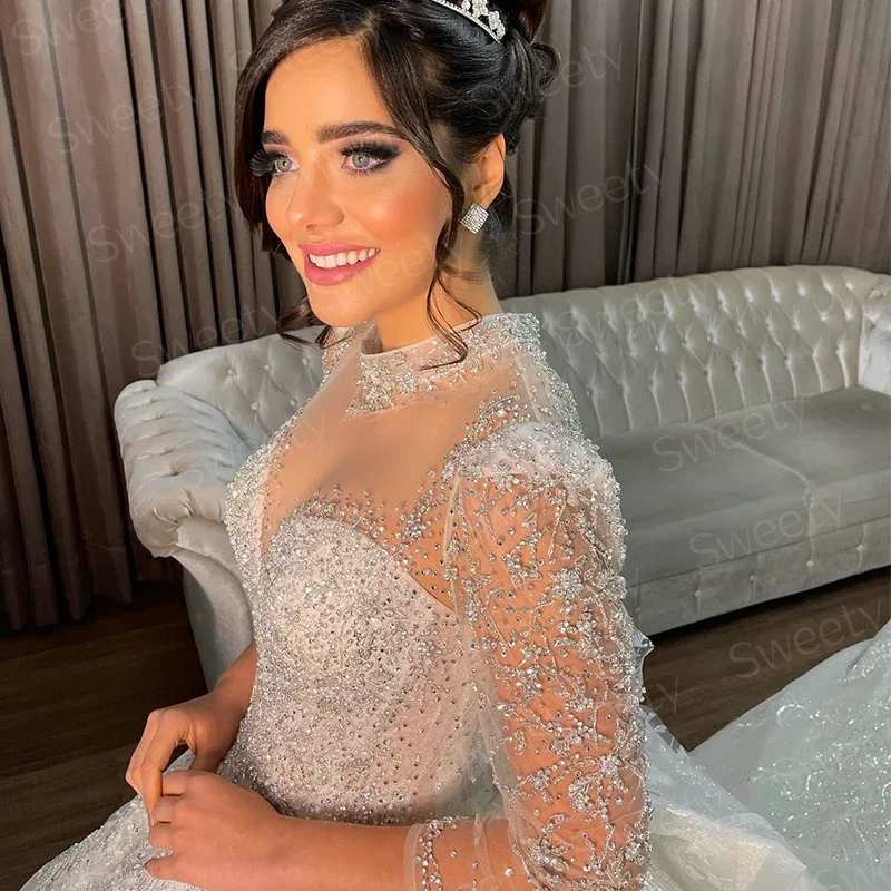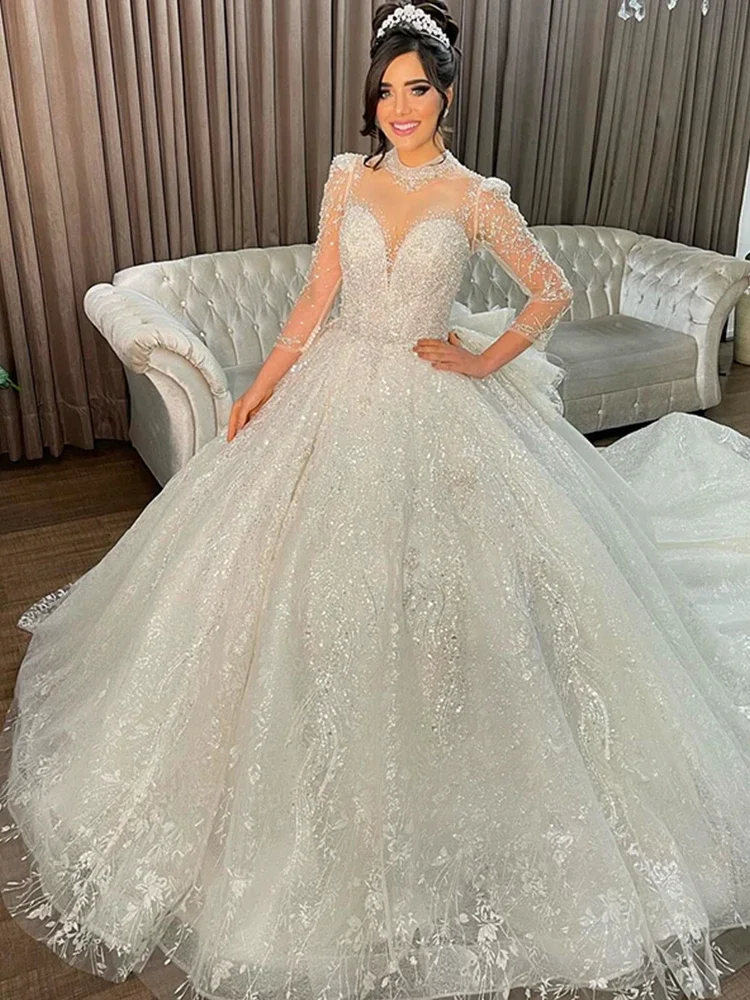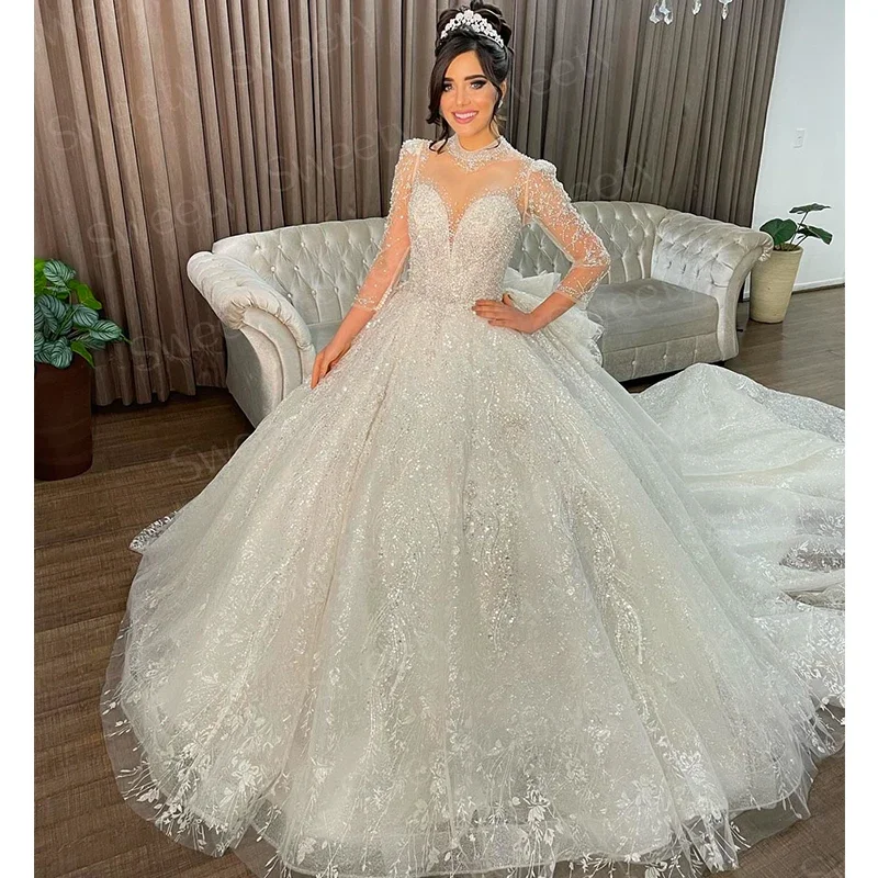 Robe de mariée à paillettes en organza avec perles brodées, robe de Rhprincesse, col haut, manches longues, patients, personnalisée |