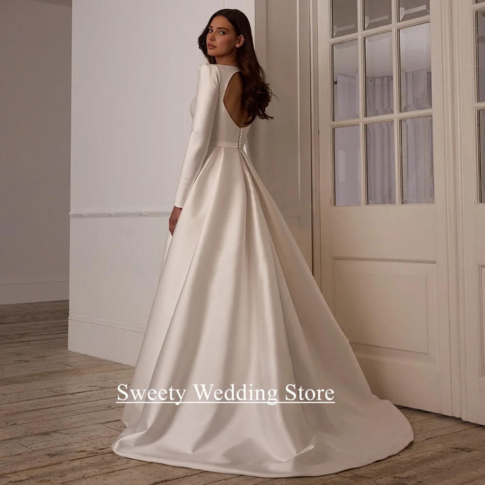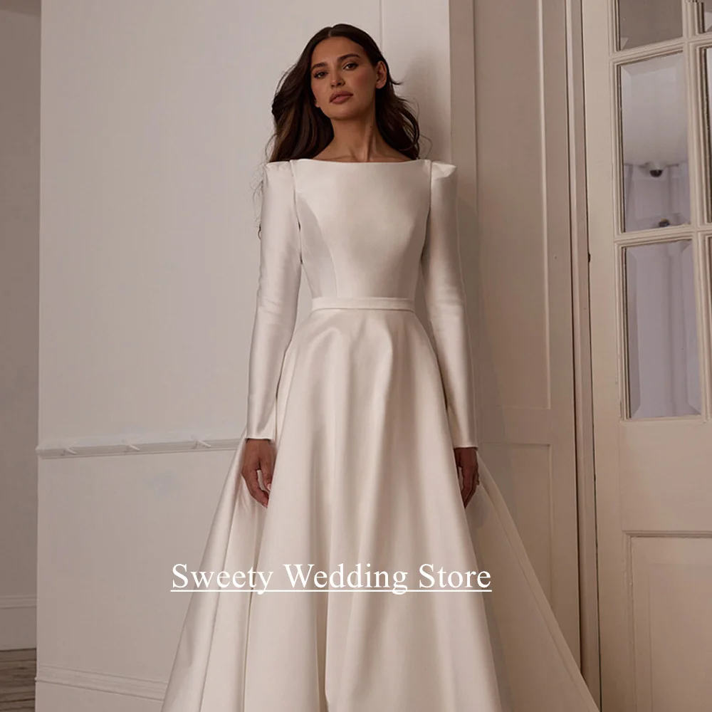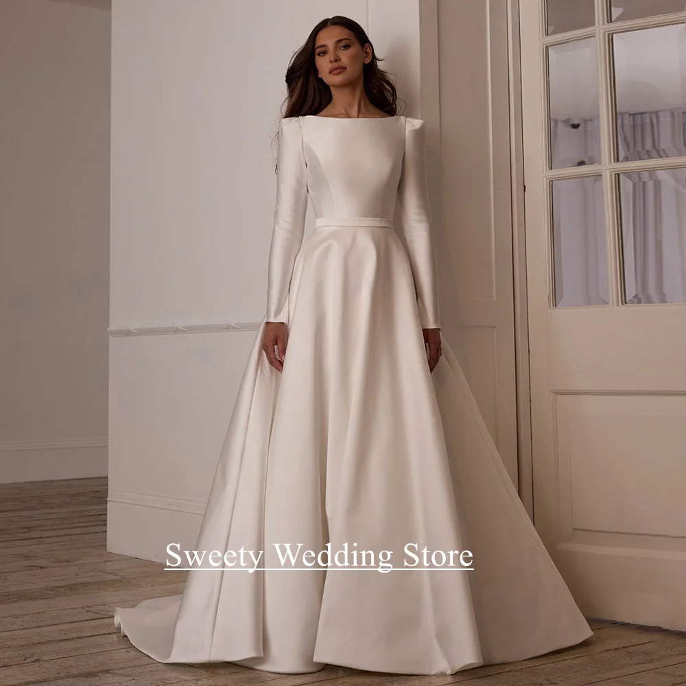 Robe de mariée arabe moderne pour femmes, personnalisée, col bateau, manches longues, traîne de balayage, dos ouvert, ligne A, robe de mariée