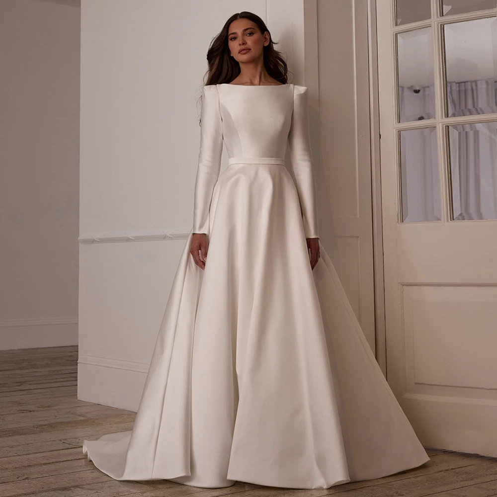 Robe de mariée arabe moderne pour femmes, personnalisée, col bateau, manches longues, traîne de balayage, dos ouvert, ligne A, robe de mariée |