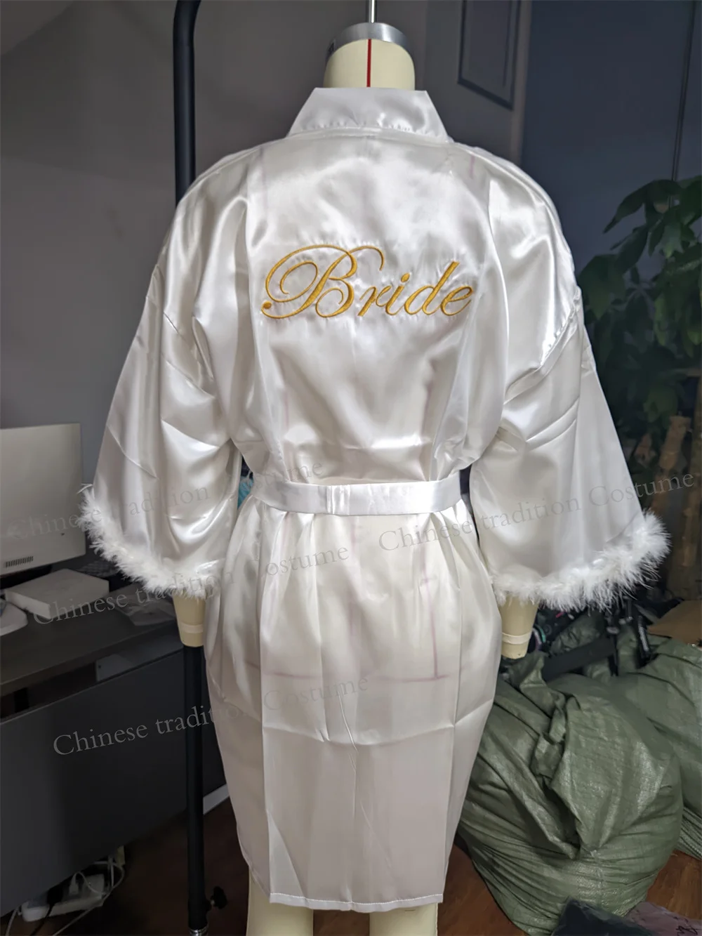 Robe de mariée blanche avec plumes pour femmes, Peignoir en Satin, robes Kimono de demoiselles d'honneur Sexy, Peignoir court, Lingerie intime de mariée |