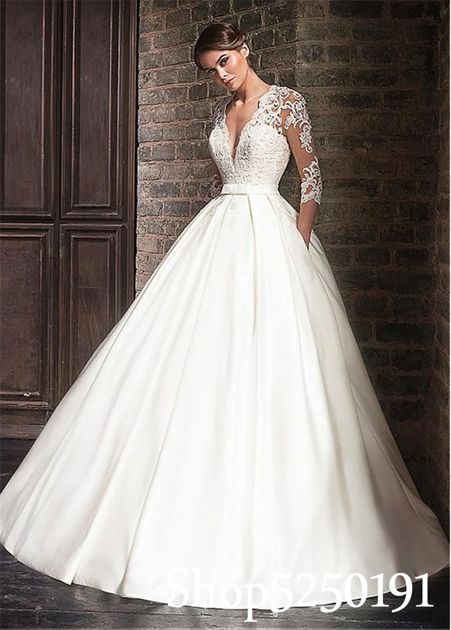 Robe de Mariée en Satin avec Dentelle et Col en V pour Femme Arabe, Vêtement de Luxe, Manches 3/4, avec Poche |