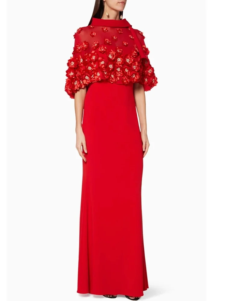 - Robe de soirée élégante et sophistiquée avec des détails travaillés (fleurs, perles, cape)