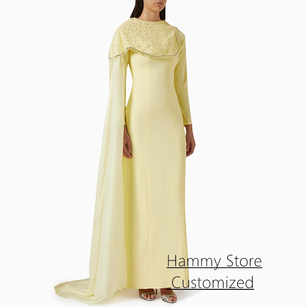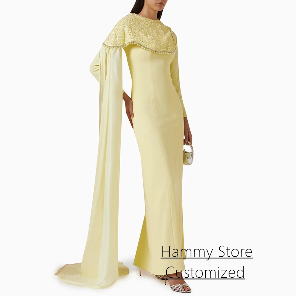 Robe de soirée arabe personnalisée, col rond, manches longues, perles, paillettes, robe de bal arabe, fente au dos