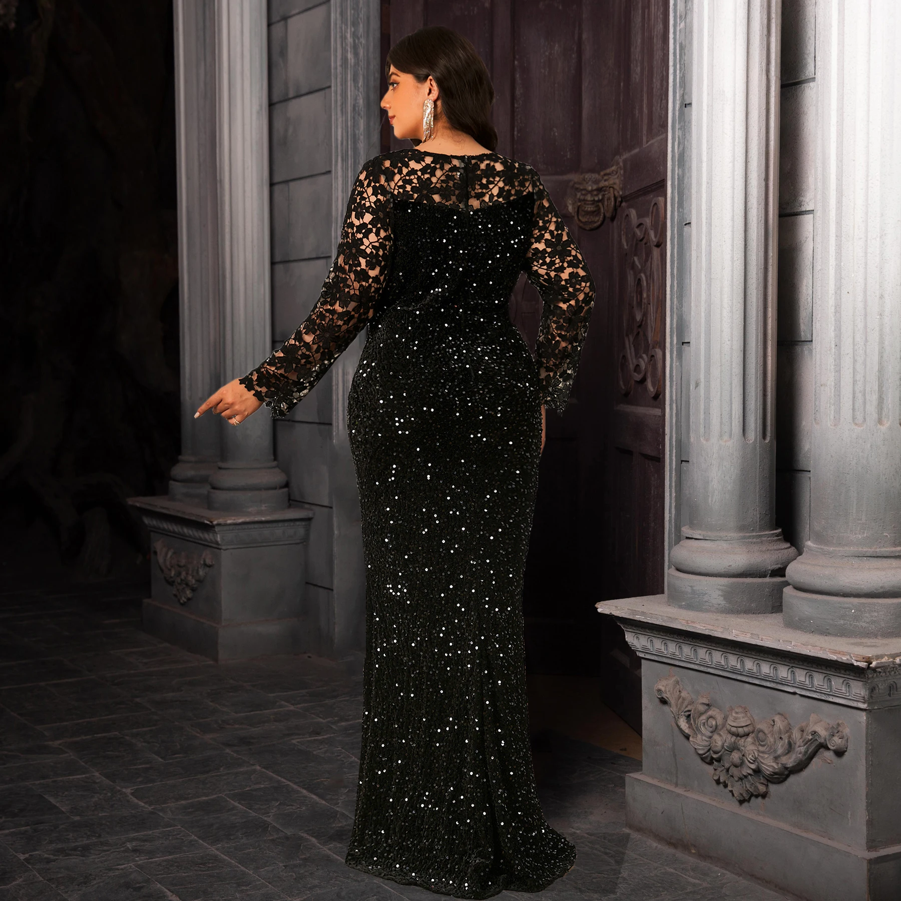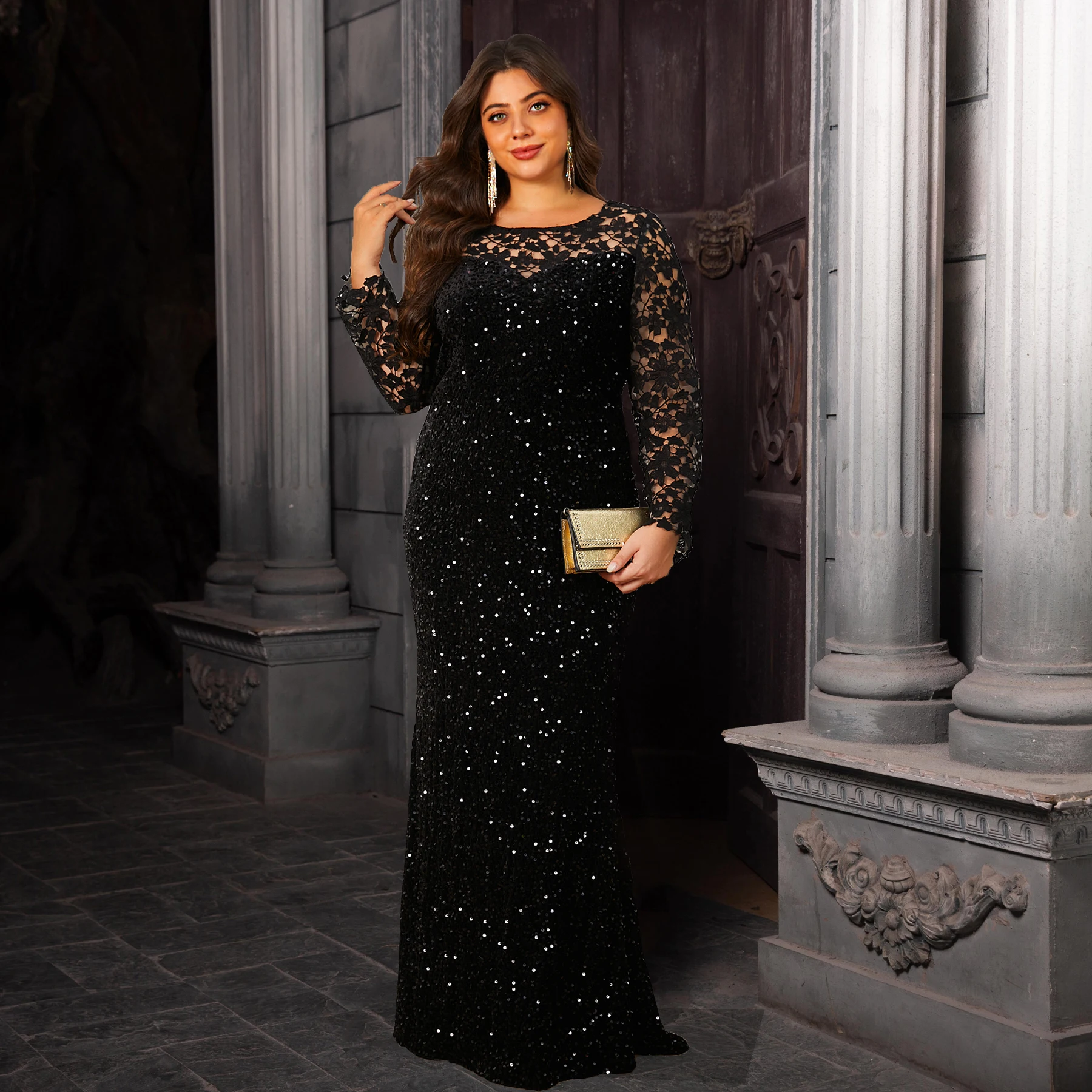 Robe de soirée courbe élégante pour femmes, dentelle, manches longues, paillettes, velours, ajouré, robe Maxi modeste |