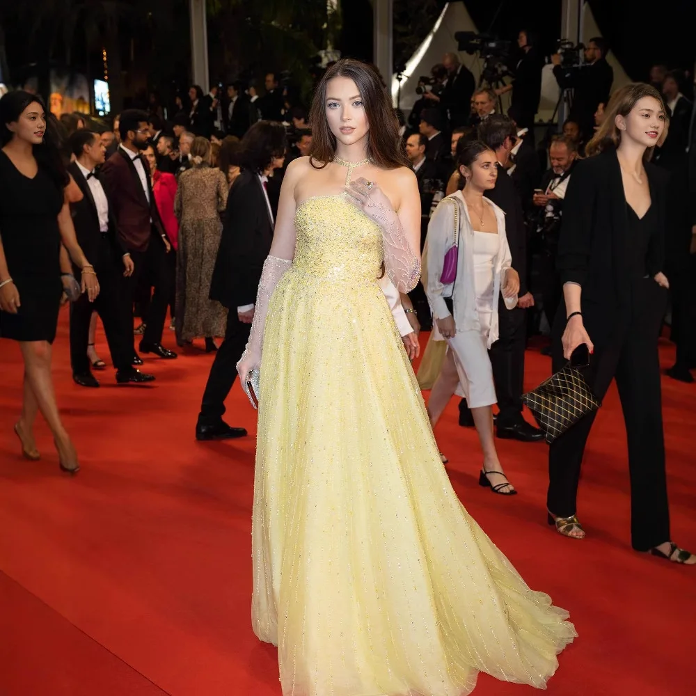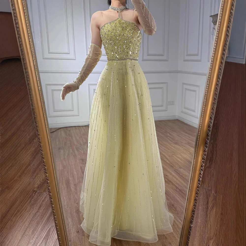 Robe de soirée de luxe scintillante, col licou jaune perlé, avec gants, pour occasions formelles en arabe saoudien, Serene Hill, personnalisée, LA72948 |