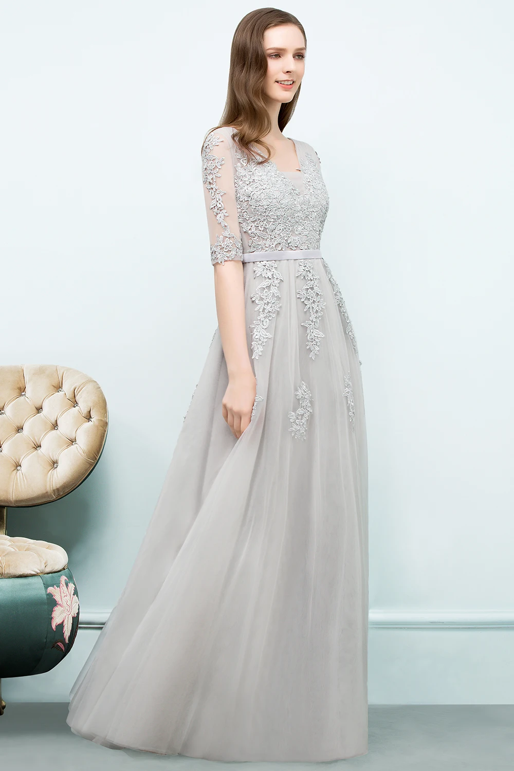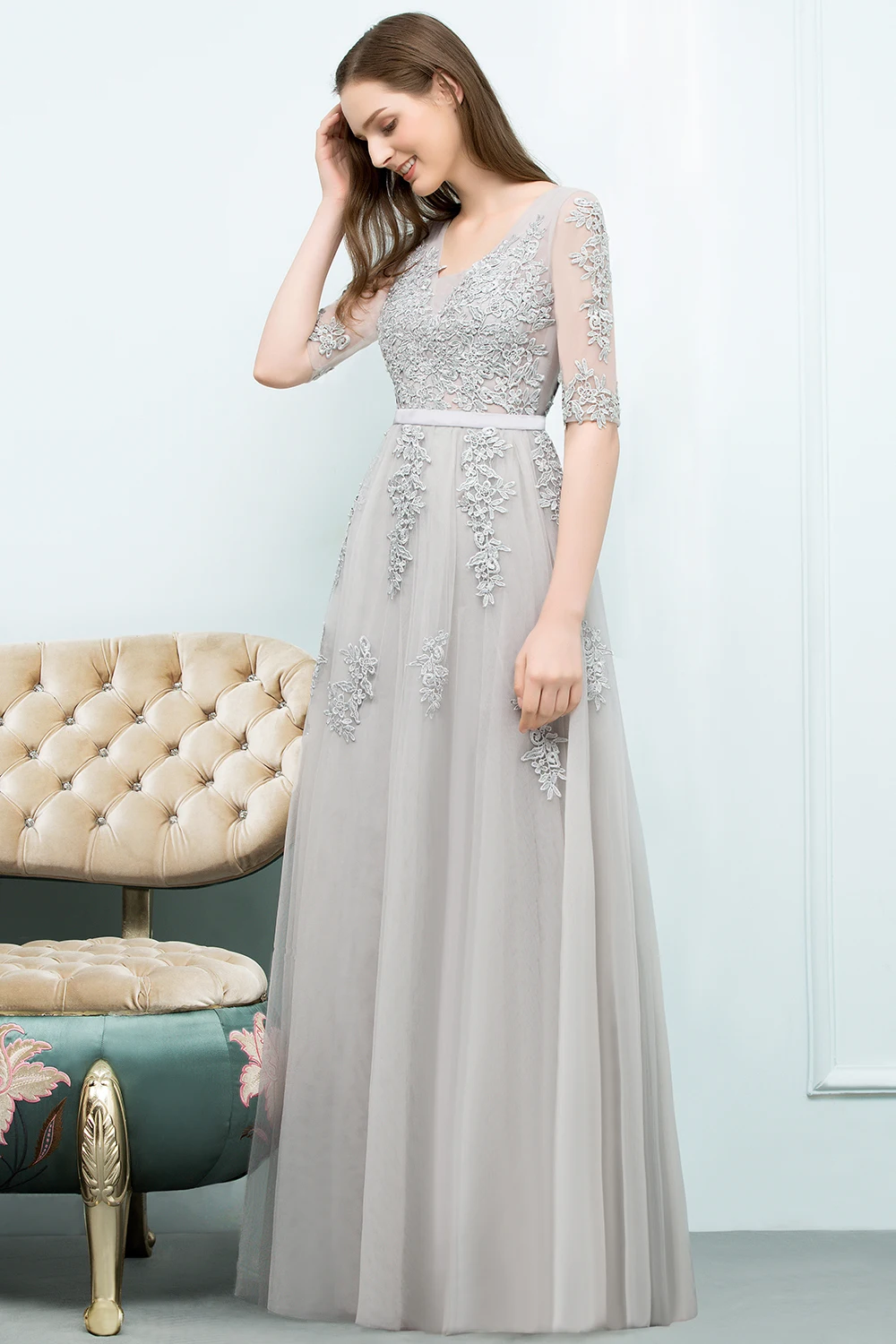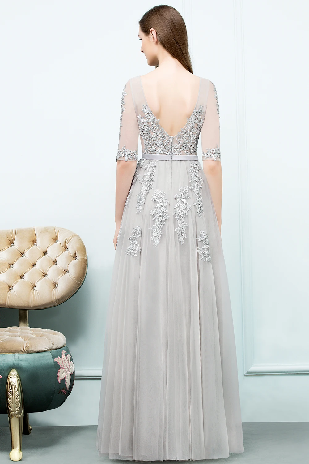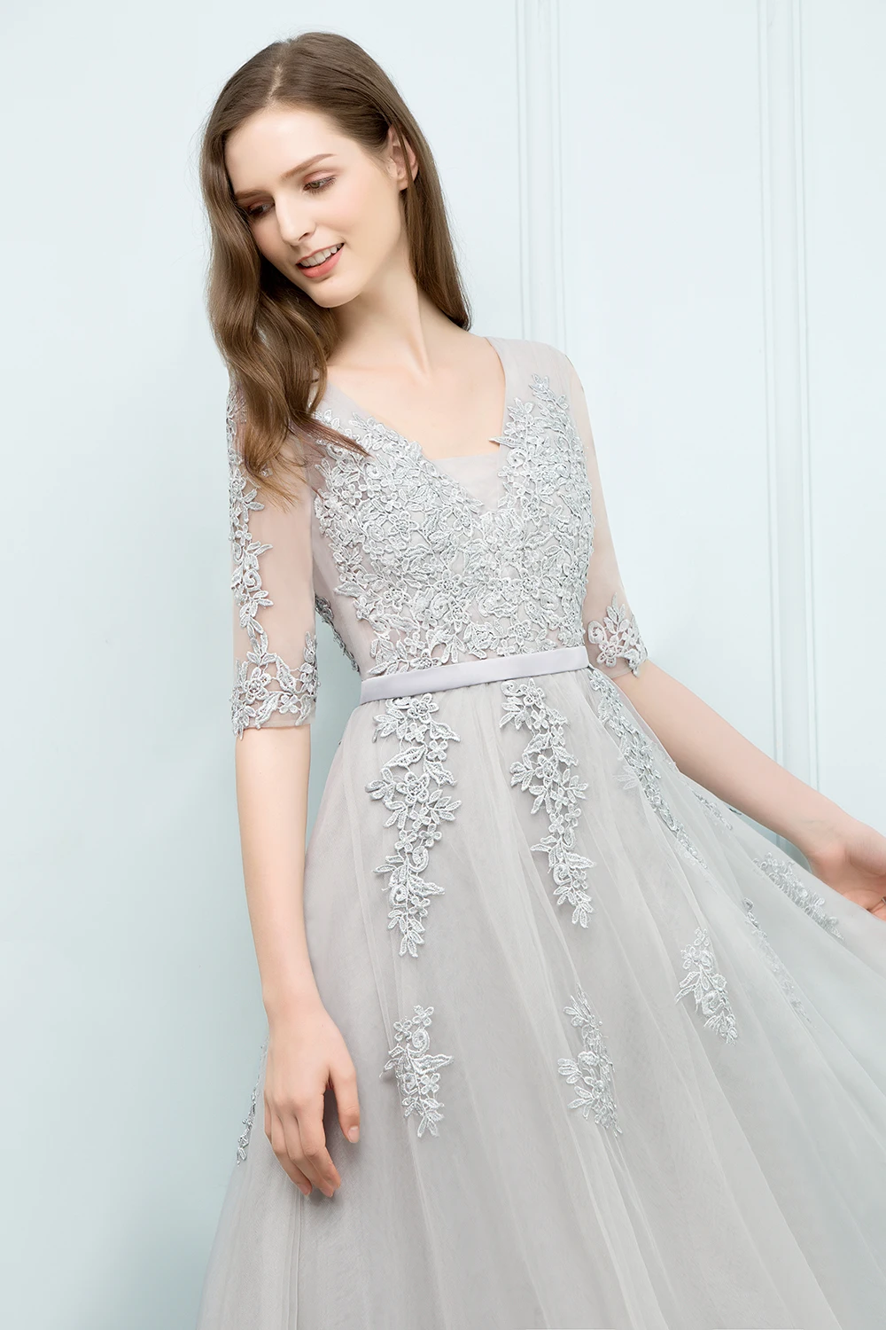 Robe de soirée élégante à manches mi-longues, avec des Appliques en dentelle, ligne a, longue bretelle en Tulle, col en v, dos nu, robe de bal Empire |