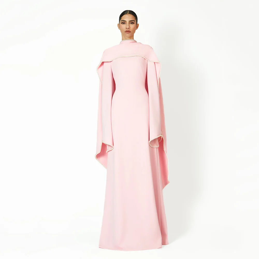 Robe de soirée saoudienne rose manches longues une ligne col rond robes de soirée modestes pour les femmes 2025 perles châle robe formelle moderne |