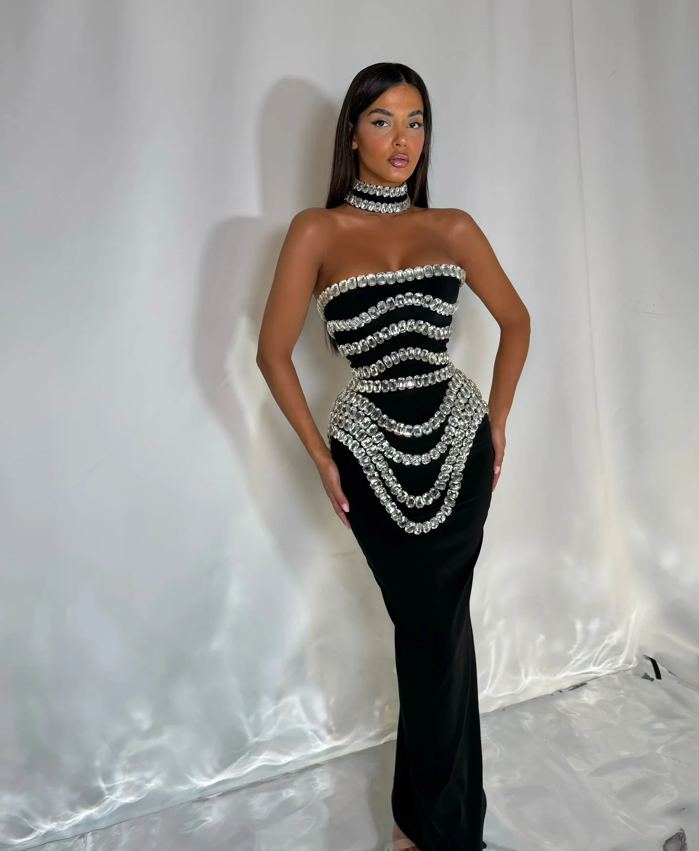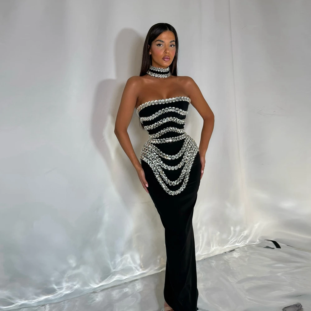 Robe de soirée sirène en Satin, cristaux scintillants, sans bretelles, longue robe de bal de luxe, perles, robes formelles de célébrité |