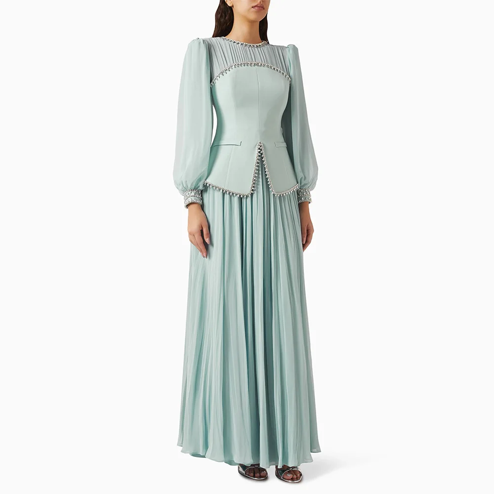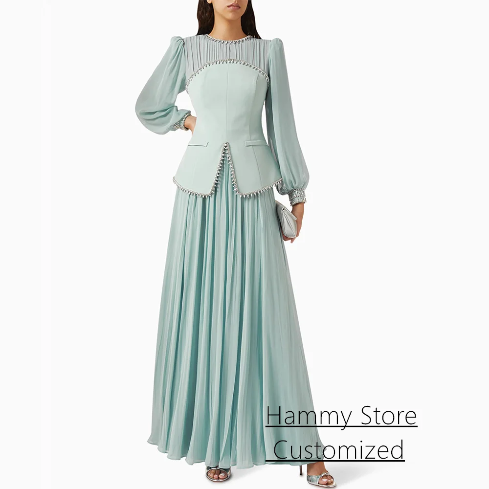 Robe de soirée spéciale robe de soirée arabe personnalisée modeste col rond manches bouffantes perles plissées robes de bal formelles |