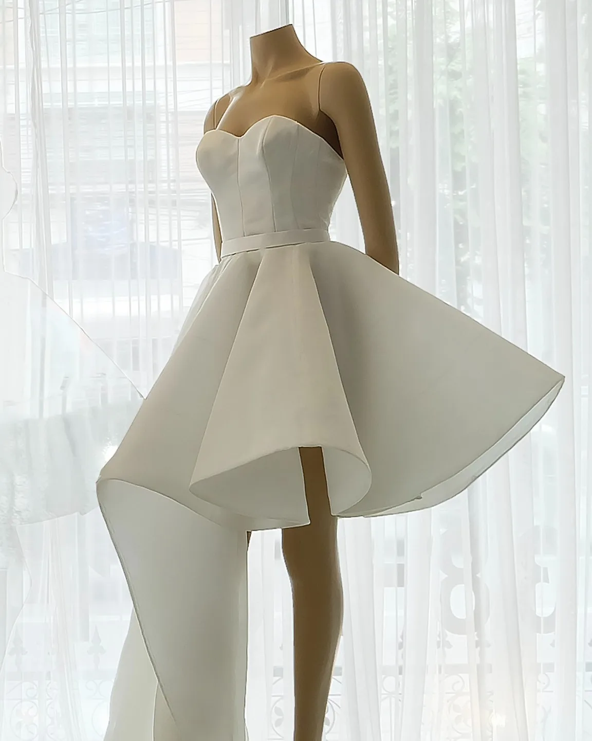 Robe de soirée trapèze asymétrique en organza élégante avec longue traîne, robe de soirée de bal en maille sans bretelles, robe d'invitées de mariage |