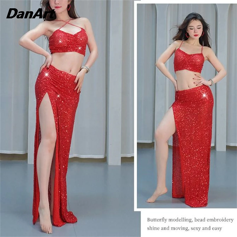 Robe d'entraînement du ventre Sexy pour femmes, haut de danse orientale à paillettes, ensemble jupe longue, Costume de danse du ventre, nouveau Costume de spectacle sur scène |