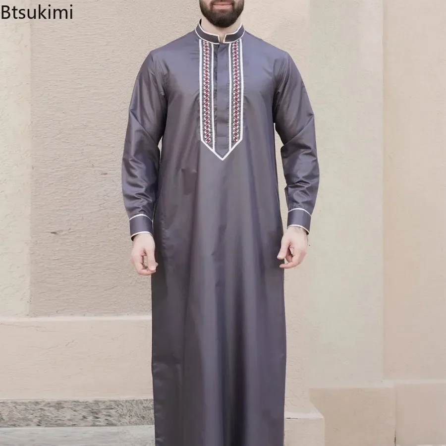 Robe longue brodée à col montant pour hommes, robe musulmane saoudienne, robe islamique du Ramadan, mode musulmane Eid, Thobe Jubba, Abaya masculine, Dubaï et arabe