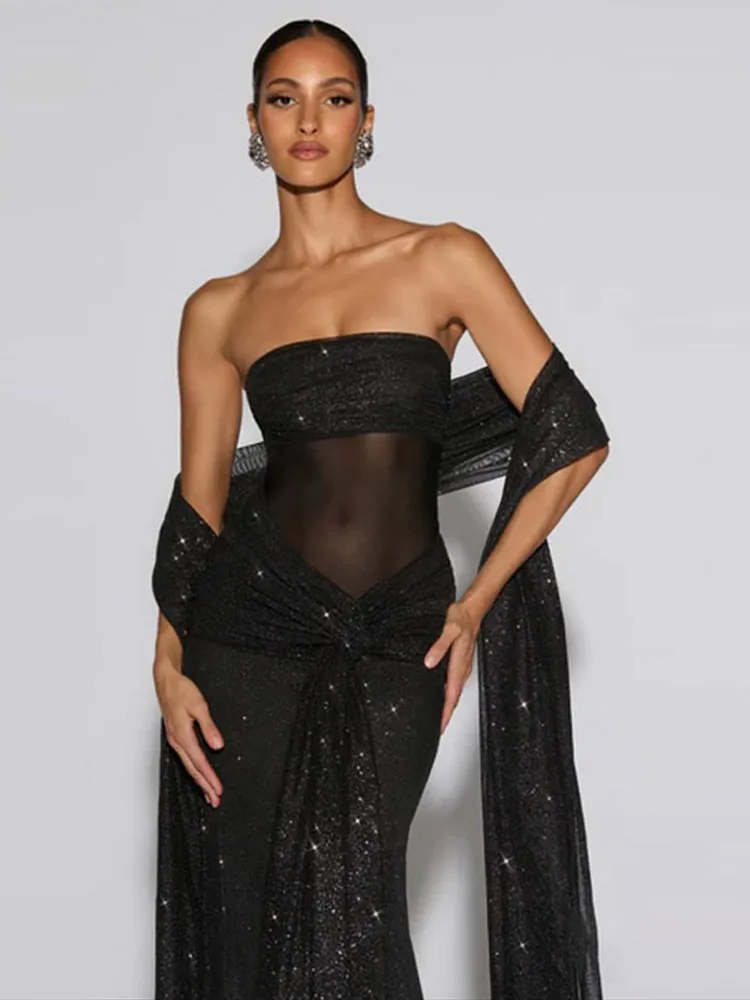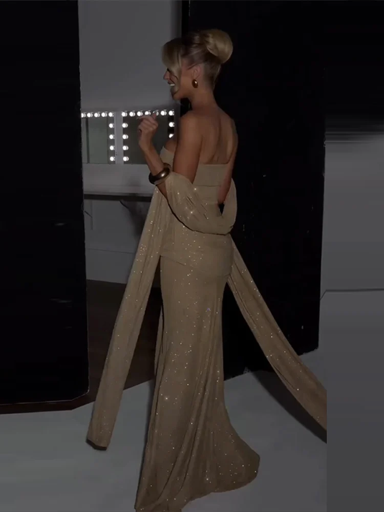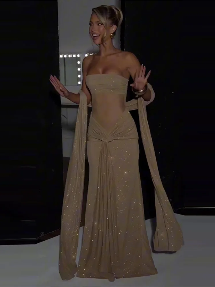 Robe longue drapée sans bretelles scintillante, Sexy, Maxi, élégante, épaules dénudées, sans manches, dos nu, froncée, Robe de soirée en boîte de nuit |