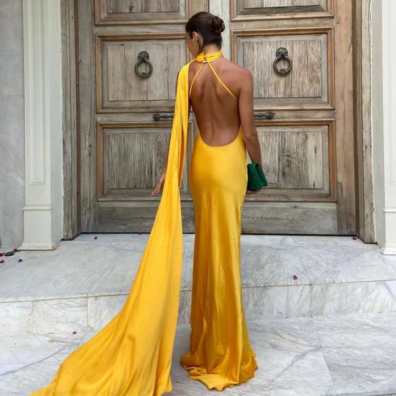 Robe longue en Satin élégante pour femmes, col licou, Sexy, sans manches, dos nu, avec écharpe, coupe cintrée, Robes de soirée, à la mode pour dames |