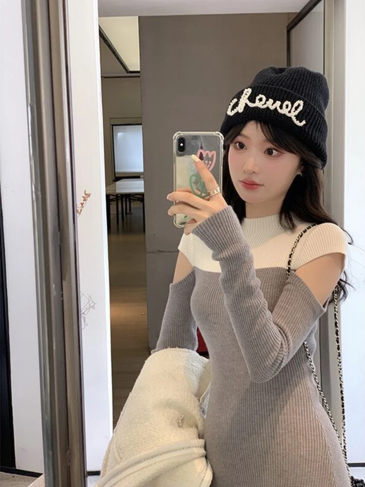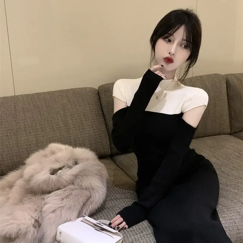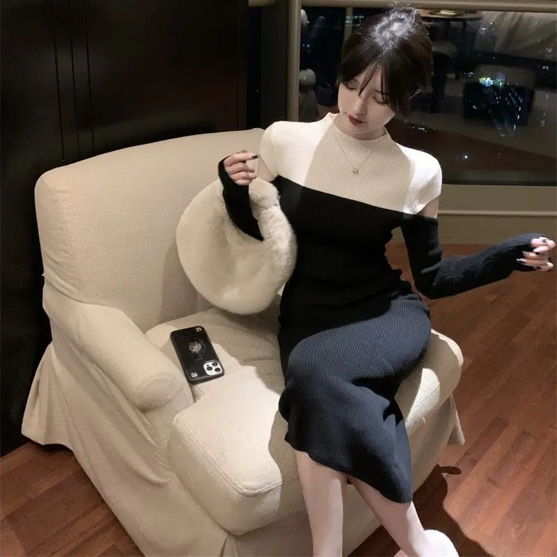 Robe Longue Grise à Col Roulé et Manches média pour Femme, Tenue de Soirée Maxi, Noire