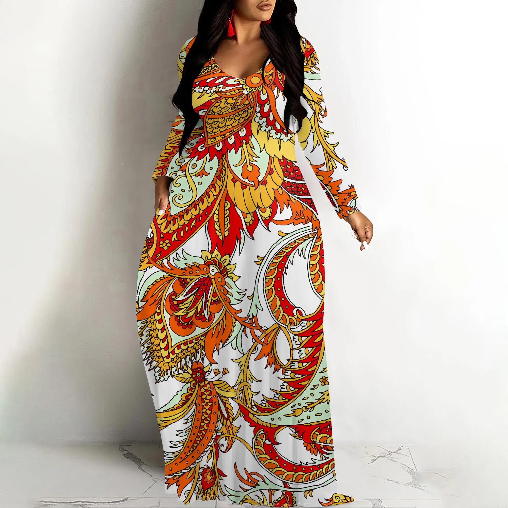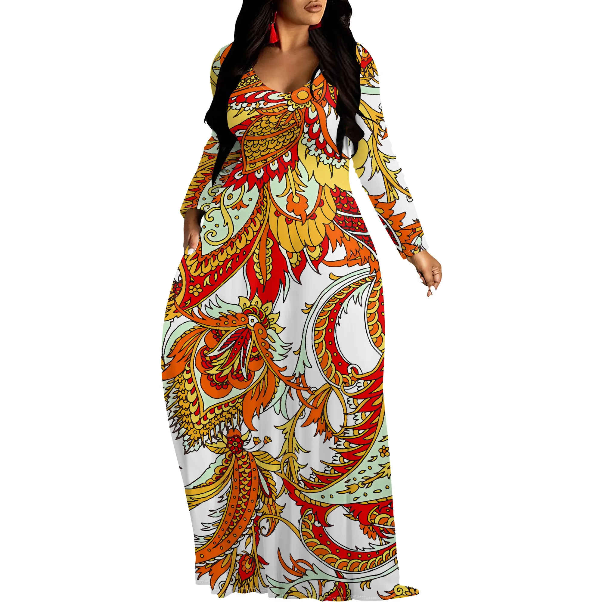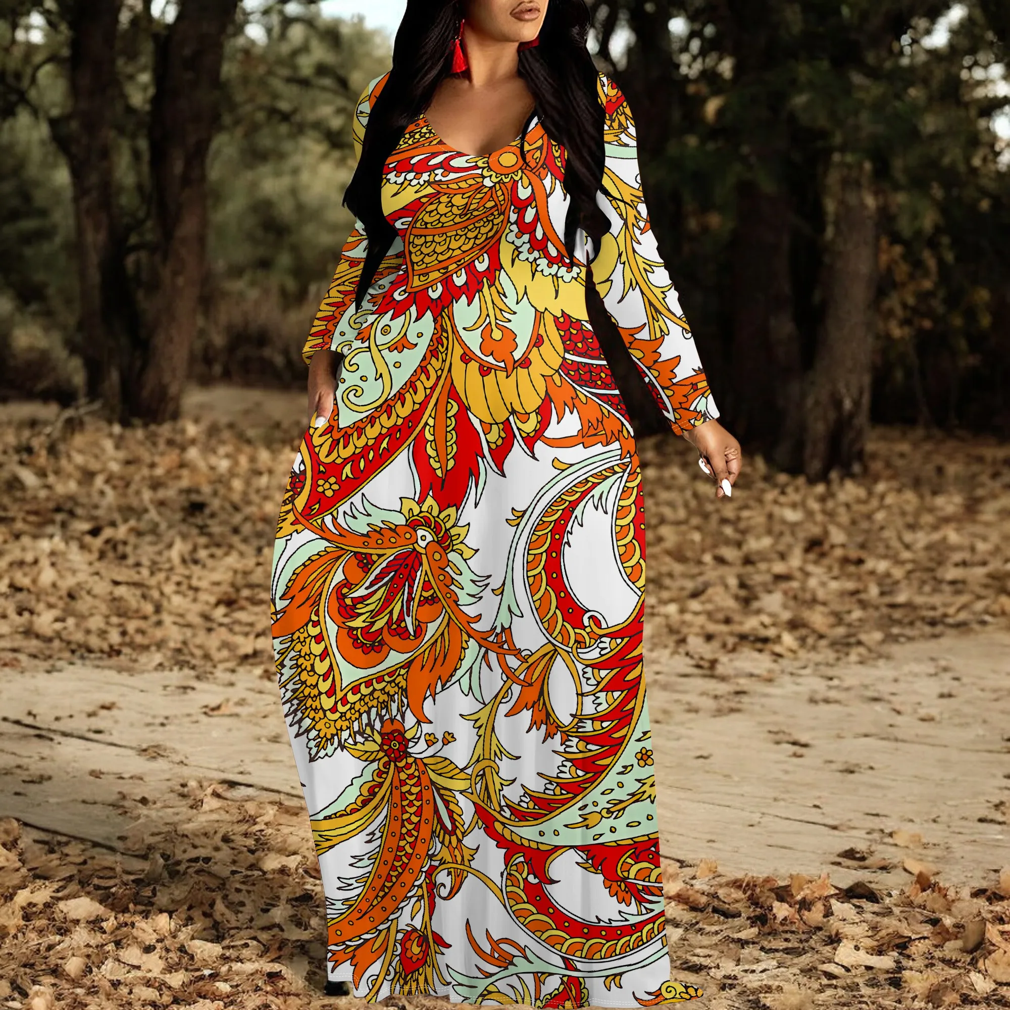 Robe longue ornée Paisley à manches longues et col en V - Vêtements de soirée Boho élégants pour femmes |